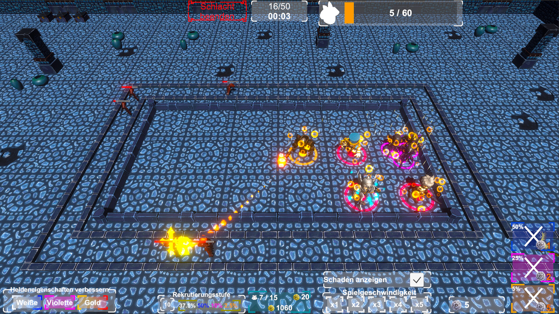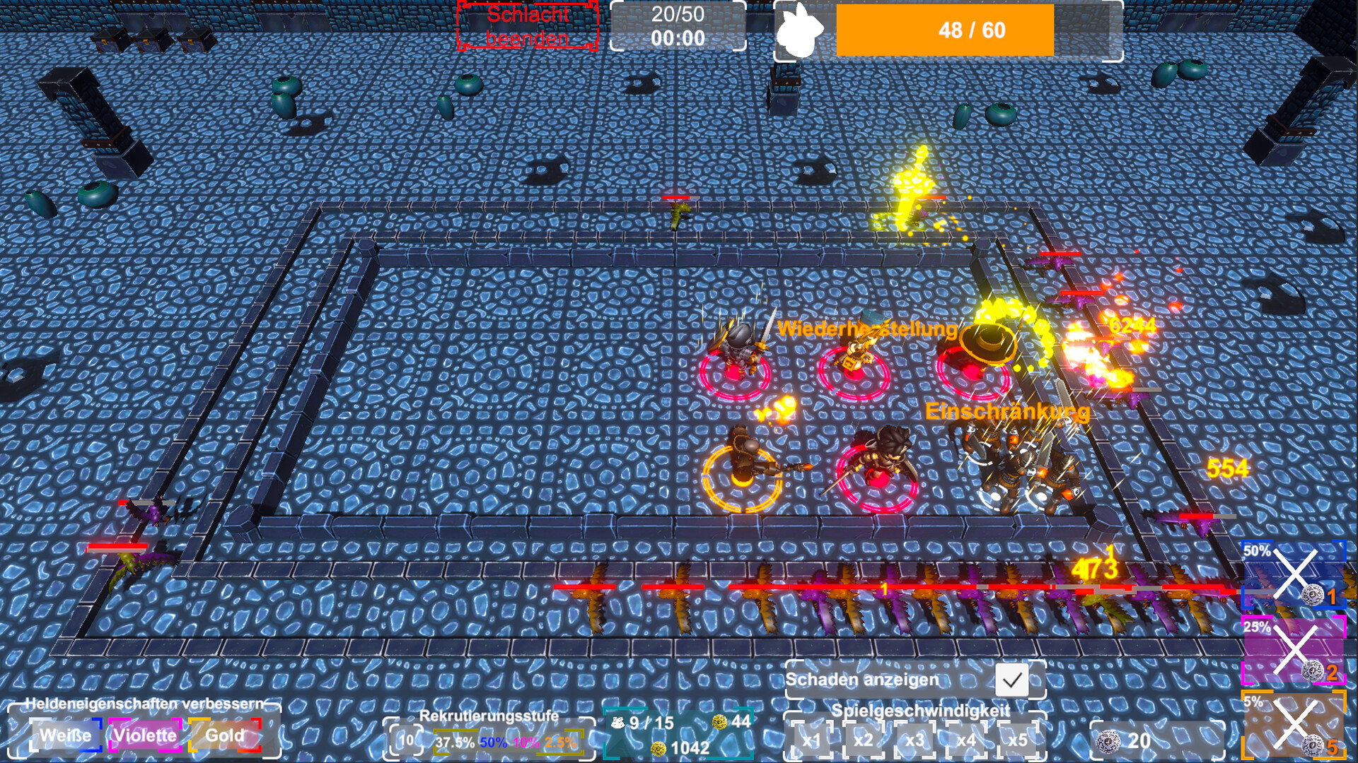Heldensynthese: Alle vier gleichen weißen Helden bilden zufällig einen blauen Helden, alle vier gleichen blauen Helden einen purpuren Helden und alle drei gleichen purpuren Helden einen goldenen Helden. Rote Helden können nur nach den Bedürfnissen und Anzahl der Helden zusammengesetzt werden.