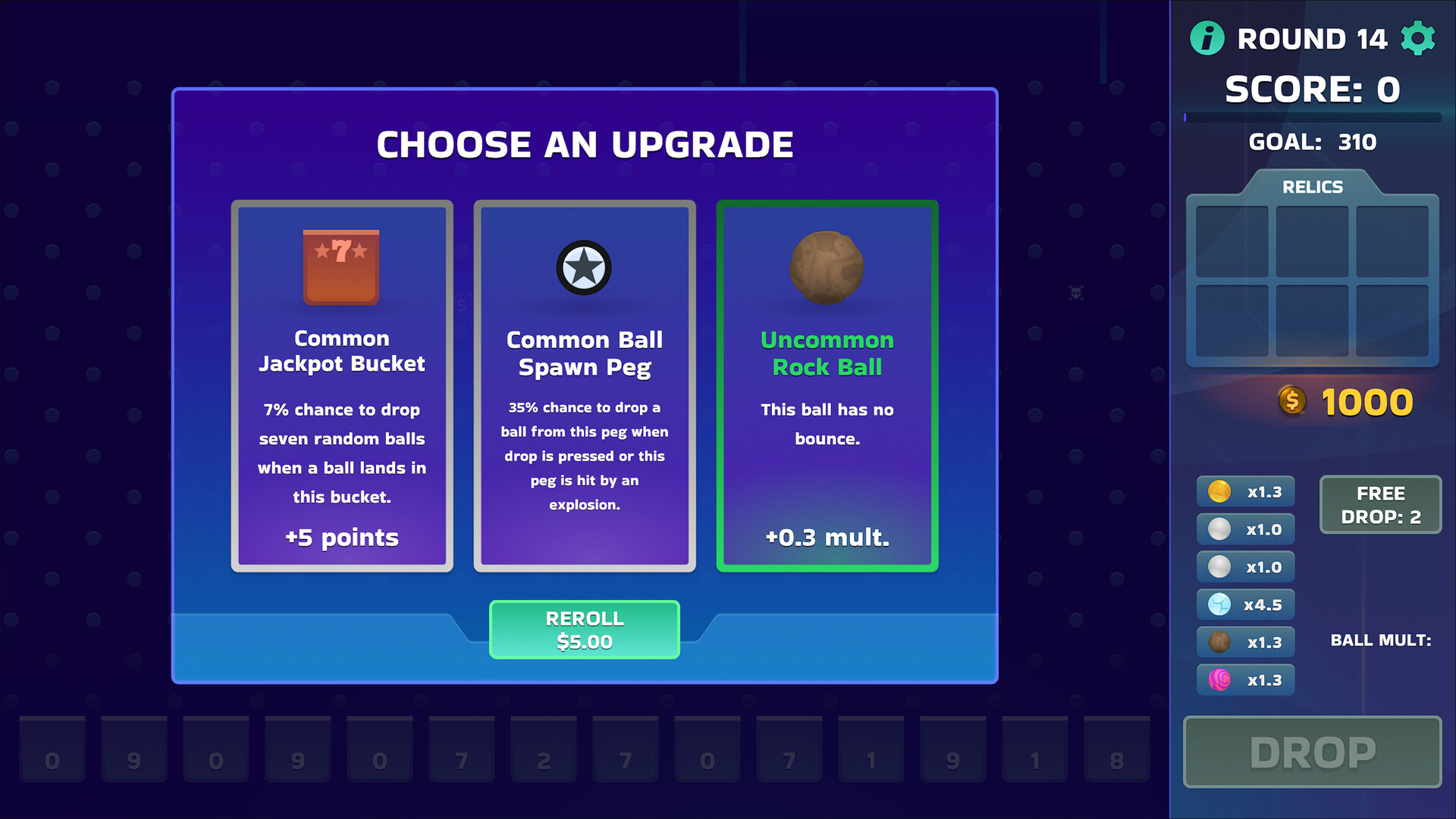 After completing a round, you’ll choose one of three upgrades that modify your balls, pegs, or buckets. Each upgrade has a rarity that affects its power.