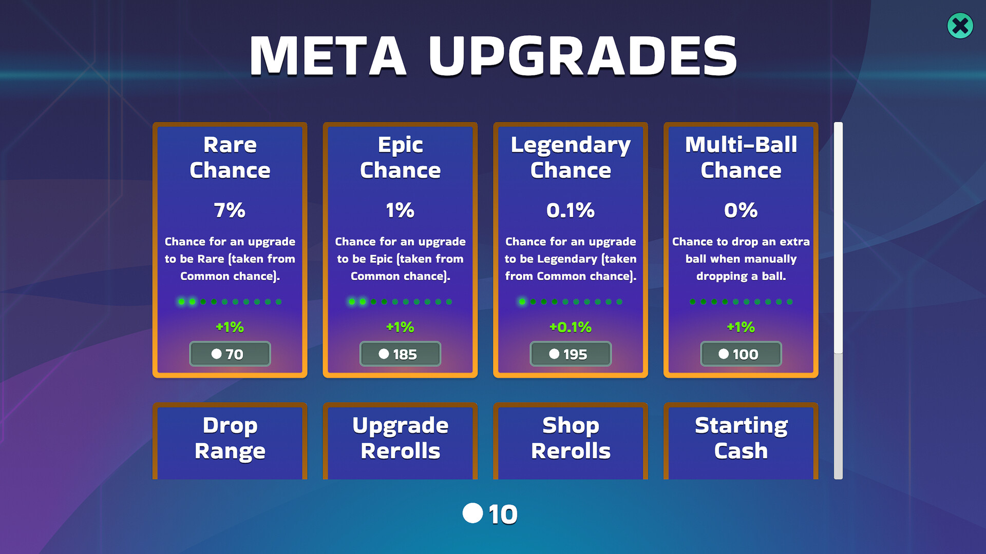 Every ball you use during a run contributes to your Meta Ball total. These Meta Balls can be spent to unlock permanent upgrades that make future runs easier and more customizable. Increase your chances of finding rare upgrades, reduce your drop randomness, unlock Rerolls and more.