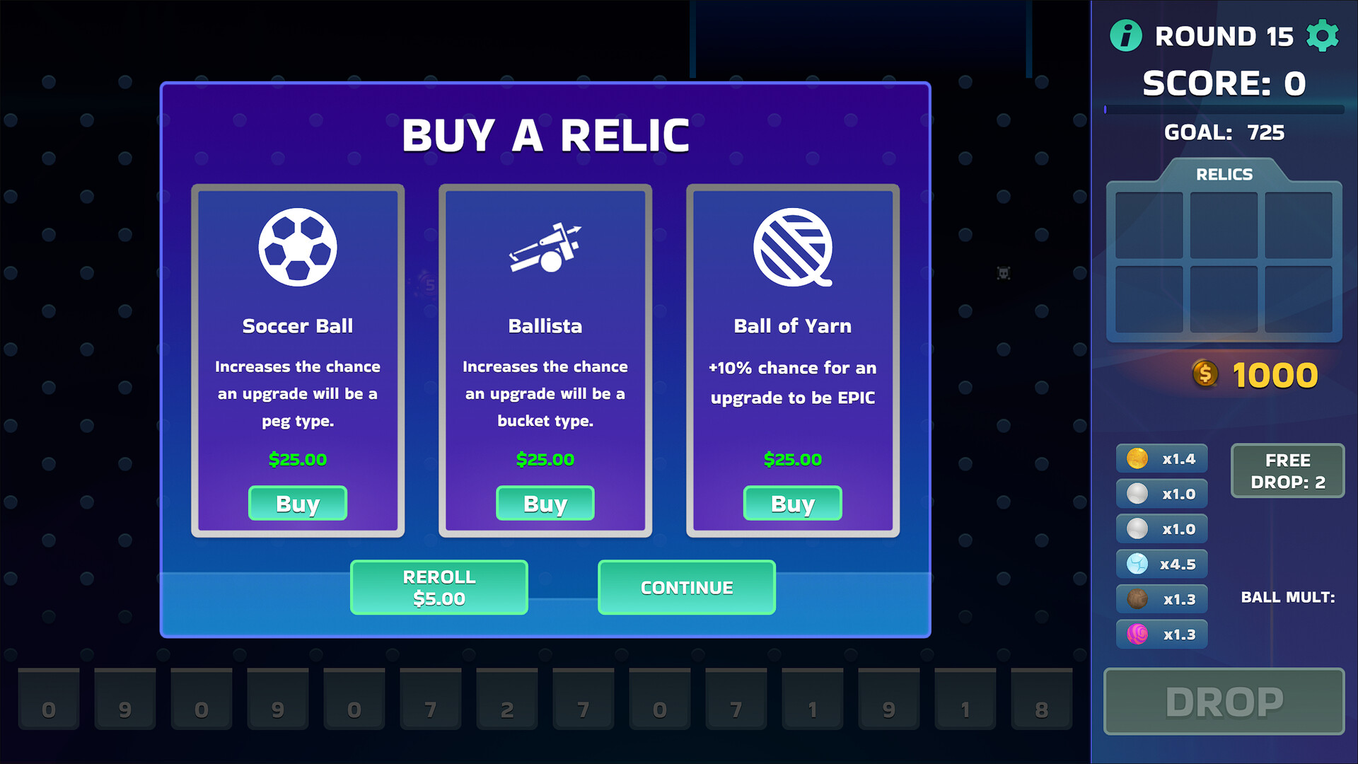 After completing a round, you’ll choose one of three upgrades that modify your balls, pegs, or buckets. Each upgrade has a rarity that affects its power.