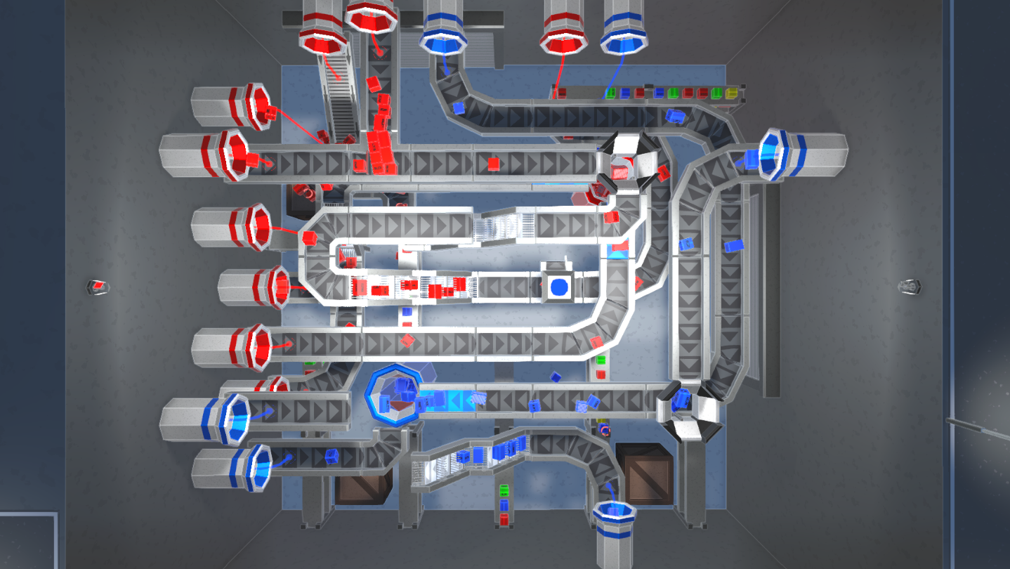 The game is about building and using a multitude of conveyors, on a grid, to make sure you can create the most optimal and organised route for different coloured physics boxes to travel on. The aim of the game is to transport these boxes to their respective coloured delivery chutes before the end of the day or you will fail and must restart.
