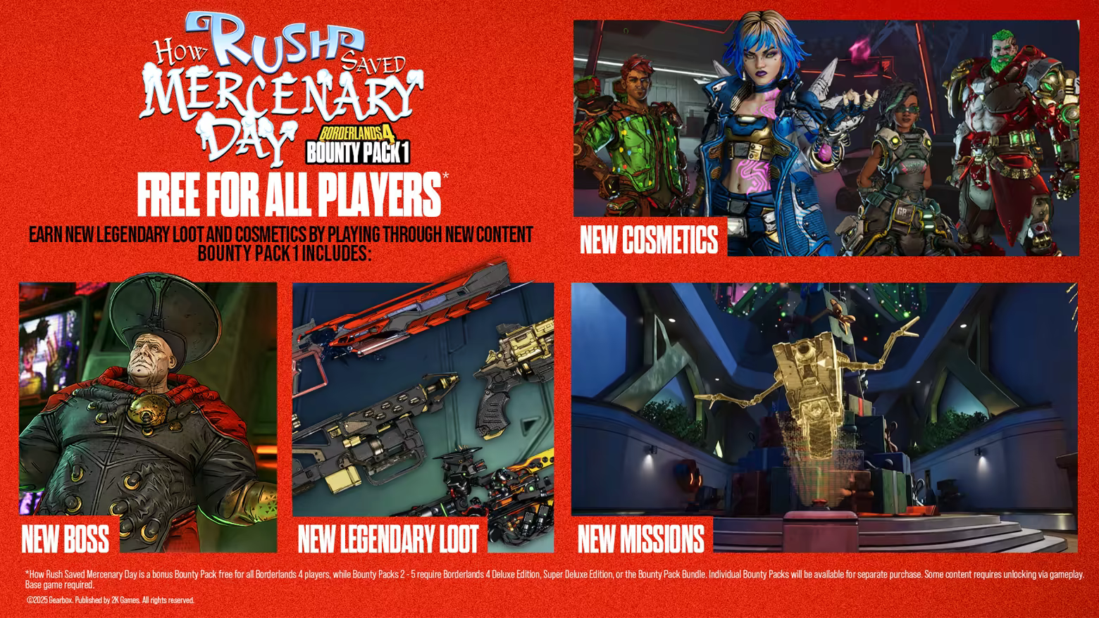 Team up with Rush for joyfully violent Mercenary Day festivities in a series of new missions, and unlock all-new gear and cosmetics in Bounty Pack 1: How Rush Saved Mercenary Day!