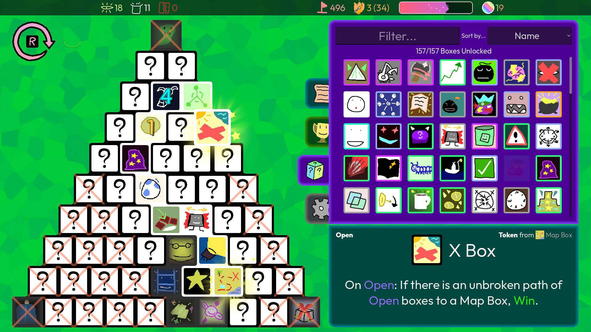 Uncover and activate the hidden effects of an ever-changing pyramid in this minesweeper-like game of mystery boxes.