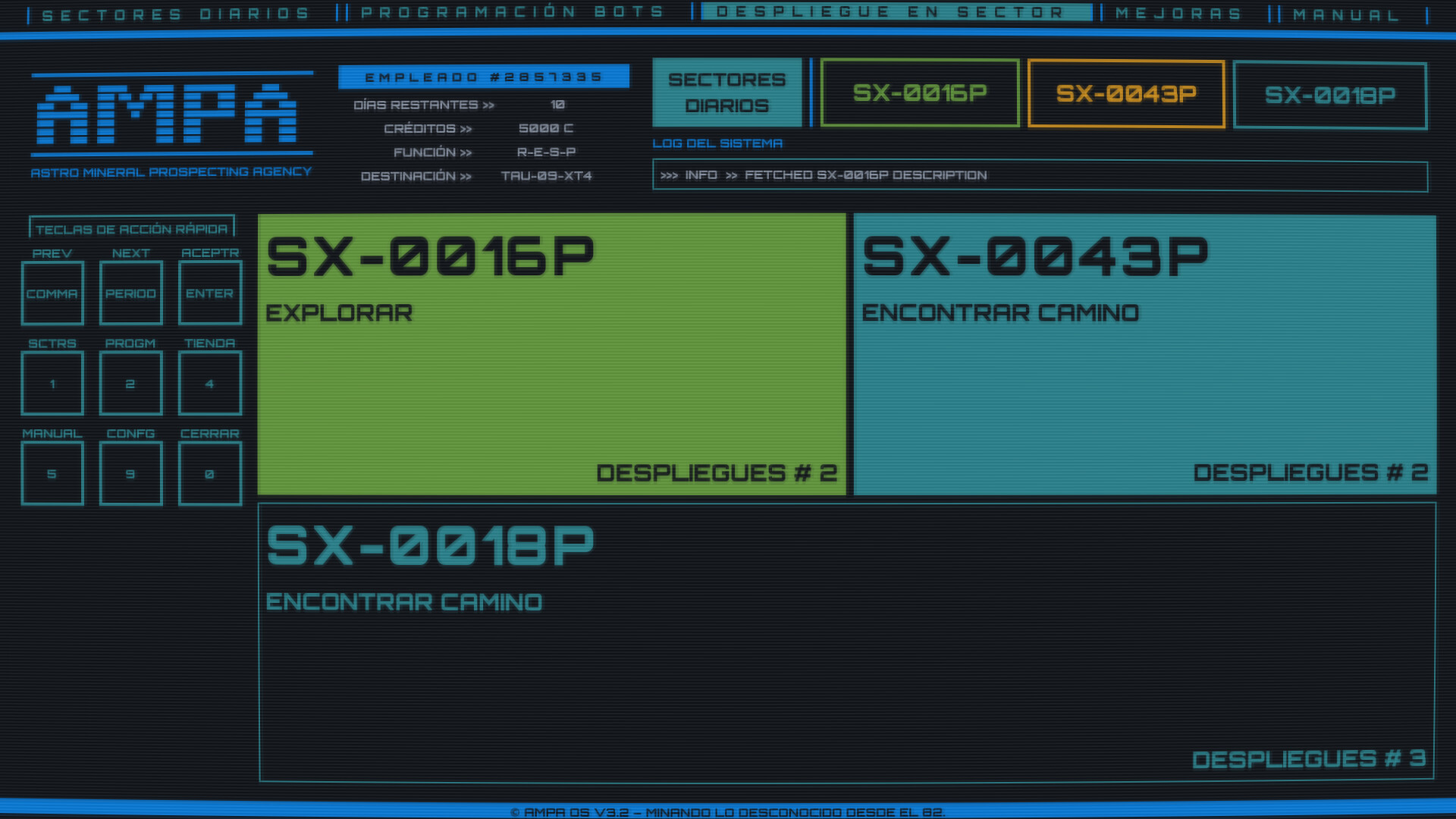 Cada día (del juego) se te asignarán tres distintos sectores para explorar. Tendrás tres despliegues para cada uno. Cada sector es un mini-puzzle de programación a resolver. Para solventarlos tienes un editor de código y una plataforma para probar tu código en una simulación del sector. Atención, las simulaciones no son perfectas, cuando los escaneos del sector contengan información desconocida la simulación entenderá esas casillas como válidas aunque en la superficie no lo sean.