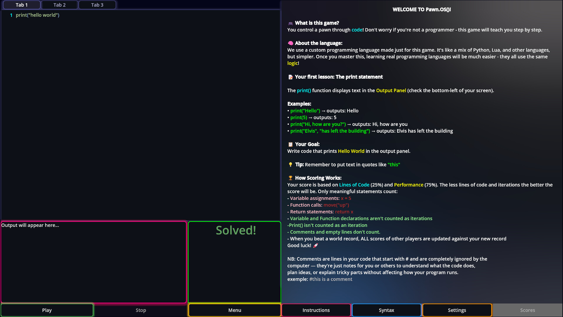 This custom language blends elements of popular programming languages like Python, Lua etc...designed specifically for this game to be easy to learn. Even if you’ve never coded before, Pawn.OS() guides you step by step through interactive, logic-driven puzzles.