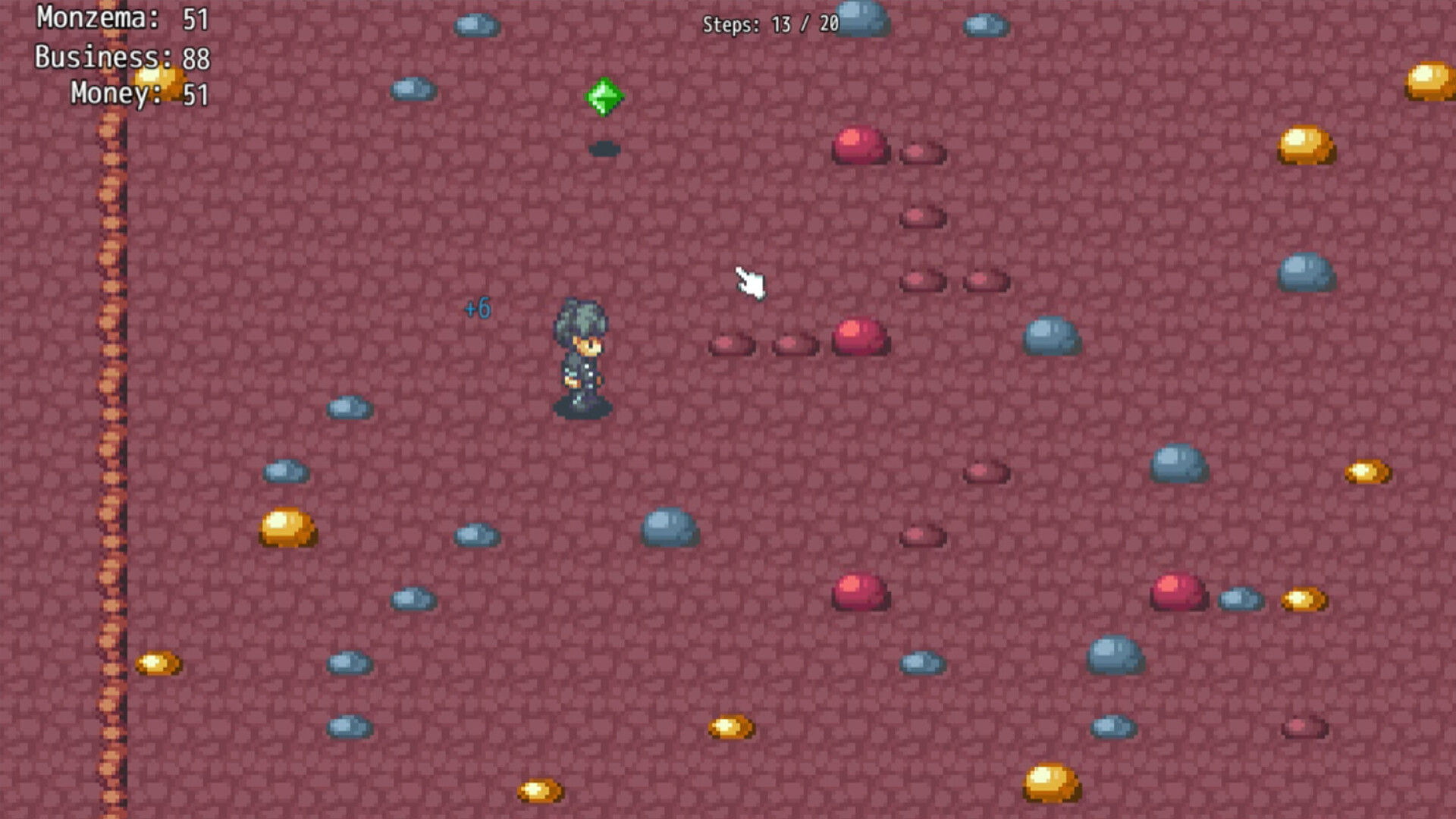 Monzema Hunting - This is a progressive mini game where you move to collect Monzema from Slime Monsters in a given step count. In the beginning you'll have only a few steps to take with limited number of slimes to hunt, but as you earn more Monzema and convert it to Money, you can upgrade various perks to help you more effectively farm Monzema.