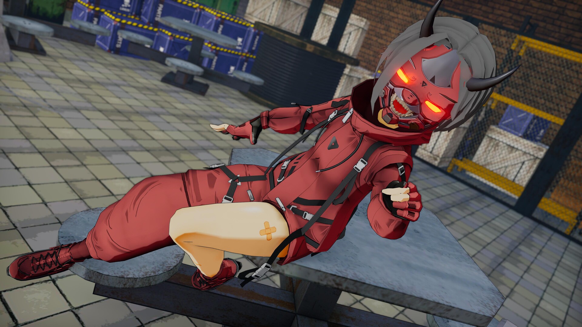 High-tech bodysuit with layered harness, tactical boots, and glowing demon mask. Built for mobility, intimidation, and fashion.