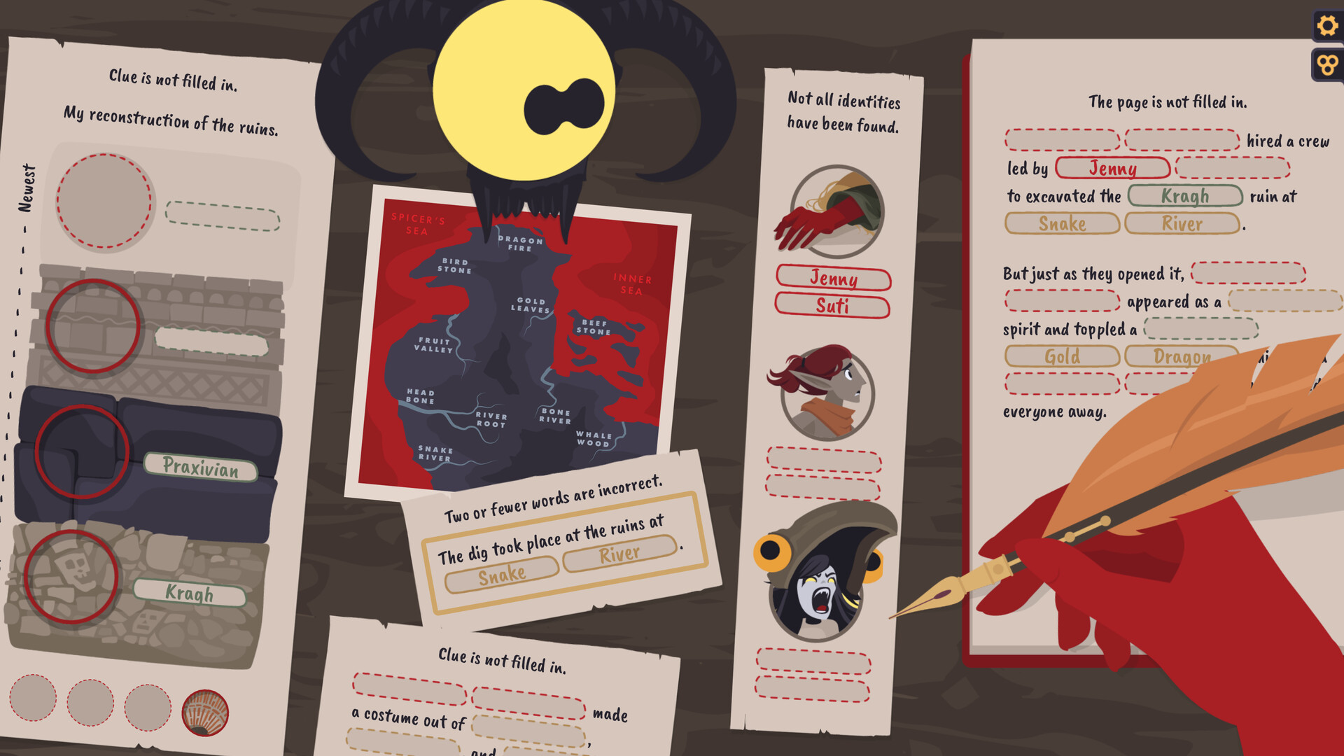 When you have gathered all the pieces of the puzzle, switch to the thinking screen. Use clues and keywords to name the killer, method, motive, and location.
