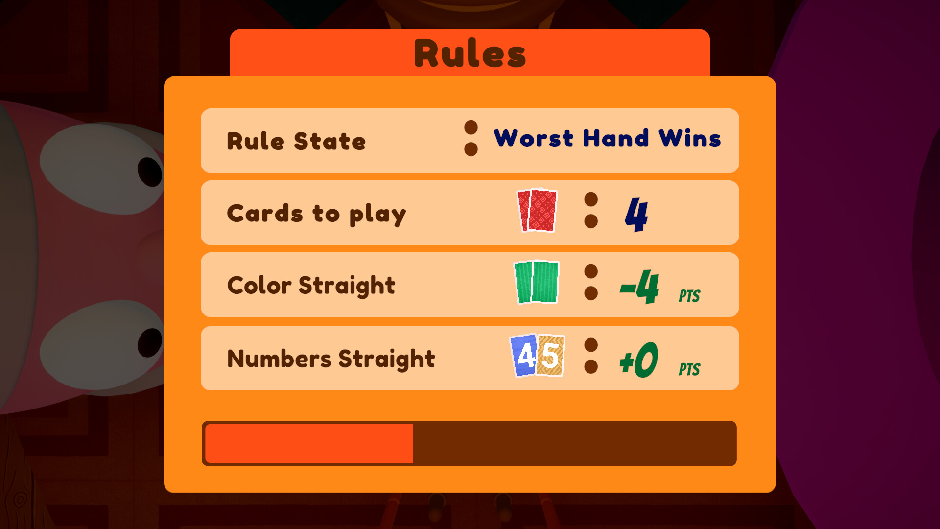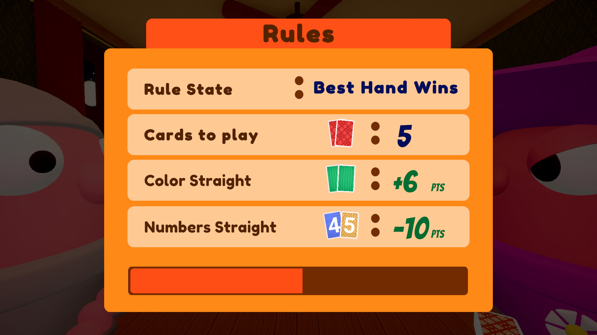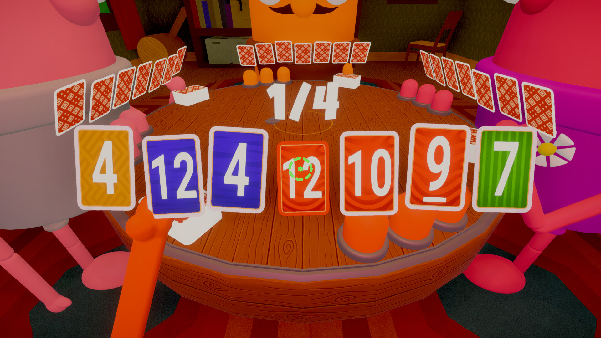 Every round in Deckout plays differently. Choose the required number of cards face-down, then reveal hands in turn. Scoring happens on the spot with clear visual feedback, while a randomly chosen round rule twists the math—sometimes boosting pairs or straights, other times flipping the logic entirely. When the dust settles, the lowest performer gets hammered and loses a heart. With only three hearts, tension builds fast; the last player standing wins.