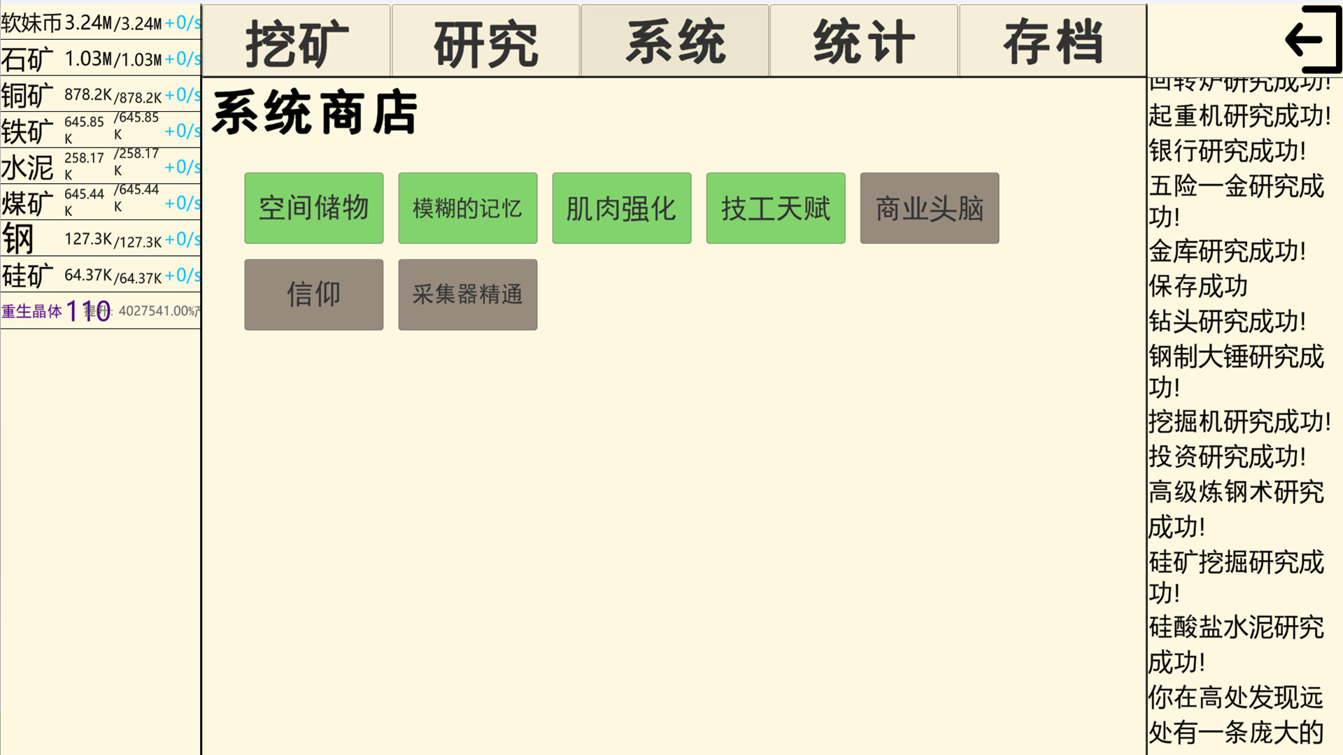 Click the mining button to start your resource collection journey. Every click will yield precious mineral resources, which are the foundation for your growth and development in the game world. Use the collected minerals to engage in technological research and unlock one powerful technology after another, from basic tools to complex automation technologies. The power of technology will safeguard your adventure.