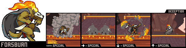 • DECOY - Through his Forward Special, Forsburn can create a smoke facsimile of himself that can attack opponents. The illusory Forsburn breaks into smoke after being hit by a single attack.