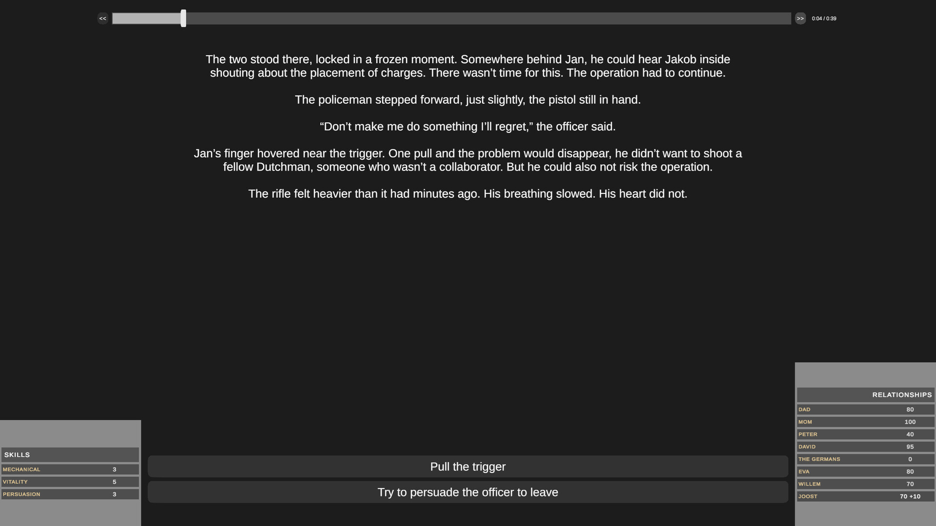 A fully narrated branching narrative game set in occupied Netherlands during World War 2. Every choice shapes the fate of a young Dutch civilian. Will you resist the Germans? Simply try to survive? Or join them in the fight against Bolshevism? Based on real events.