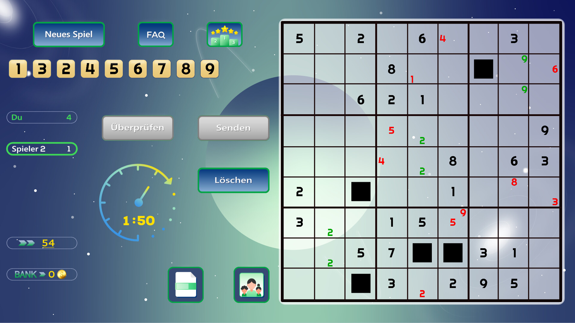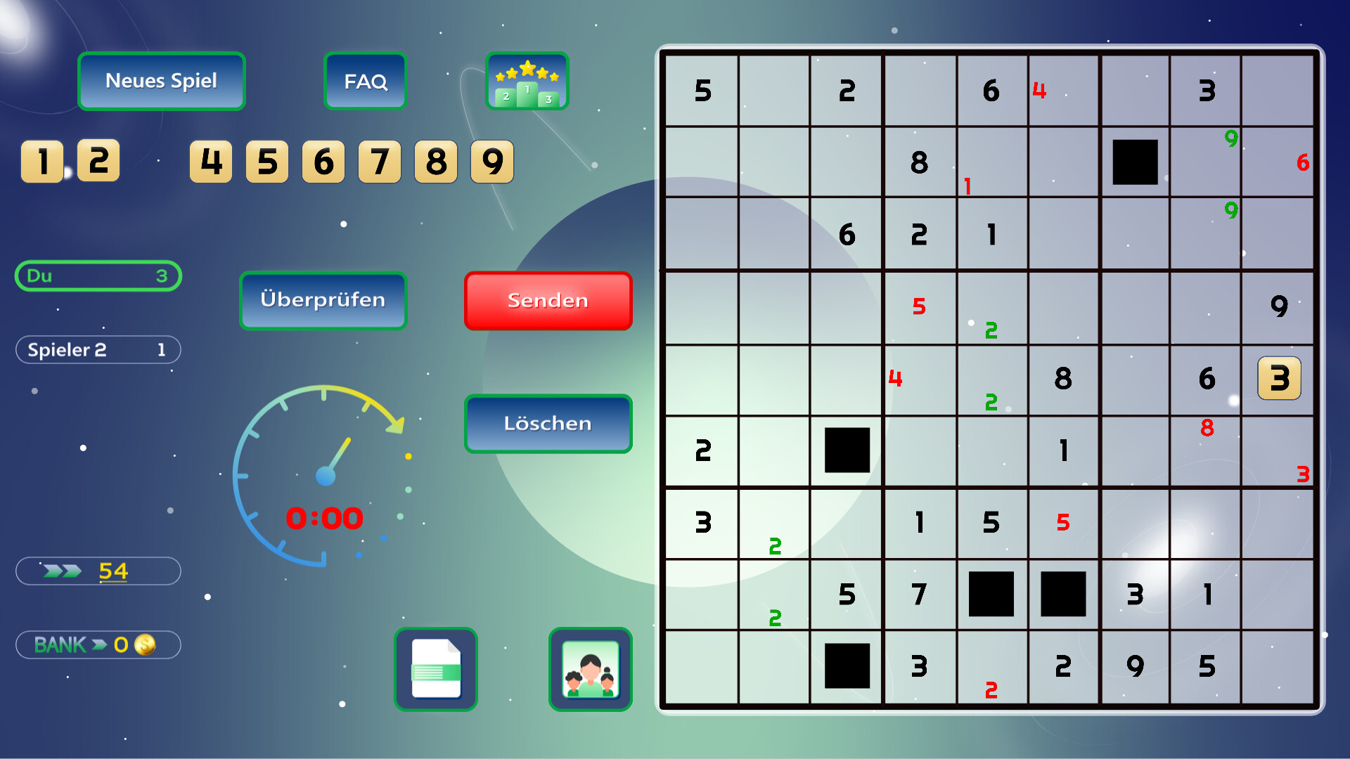 Deine Aufgabe: Fülle das mystische 9x9-Raster mit Zahlen von 1 bis 9. Aber sei vorsichtig: Hier löst du nicht nur ein Rätsel, sondern kämpfst mit deinem Gegner um jedes Feld. Behalte die Zeit im Auge, damit du deinen Zug machen kannst, bevor die Sanduhr abgelaufen ist.
