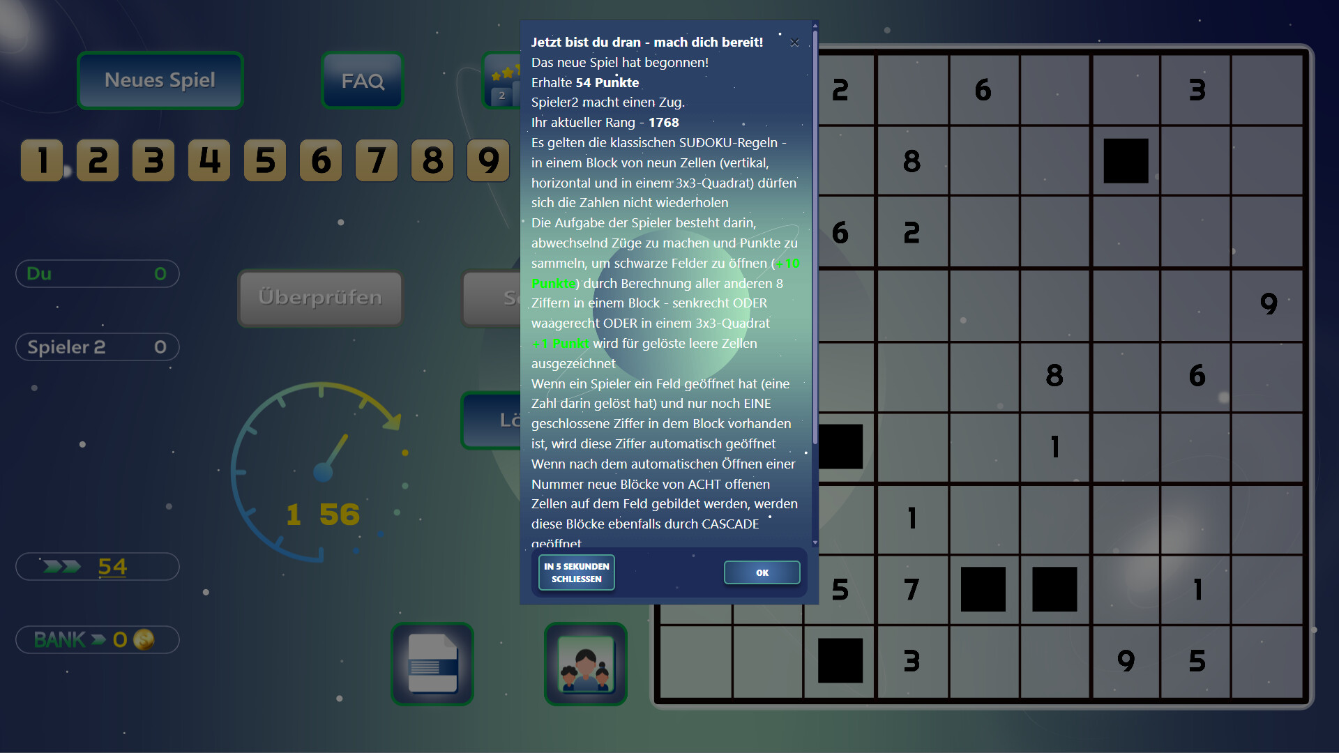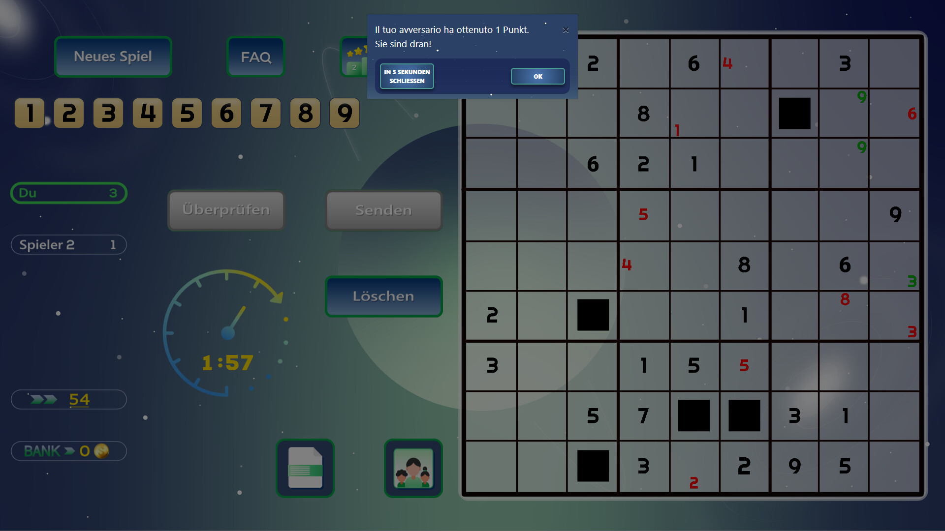 • Wetten und Sieg: Bevor das Spiel beginnt, setzt jeder von euch einen gleichen Einsatz mit seinen SUDOKU-Münzen und bildet so eine gemeinsame Bank. Der Gewinner bekommt alles!