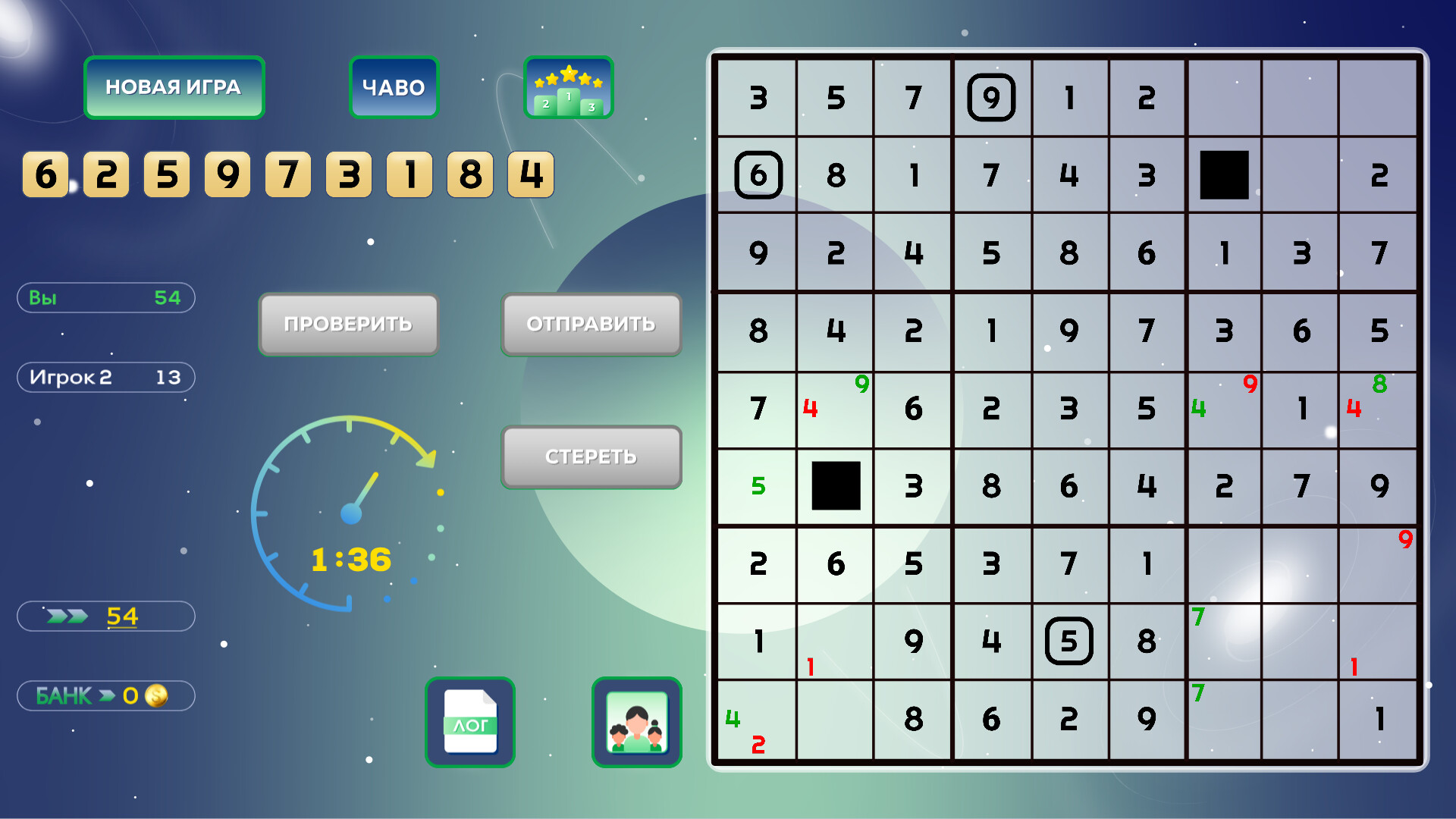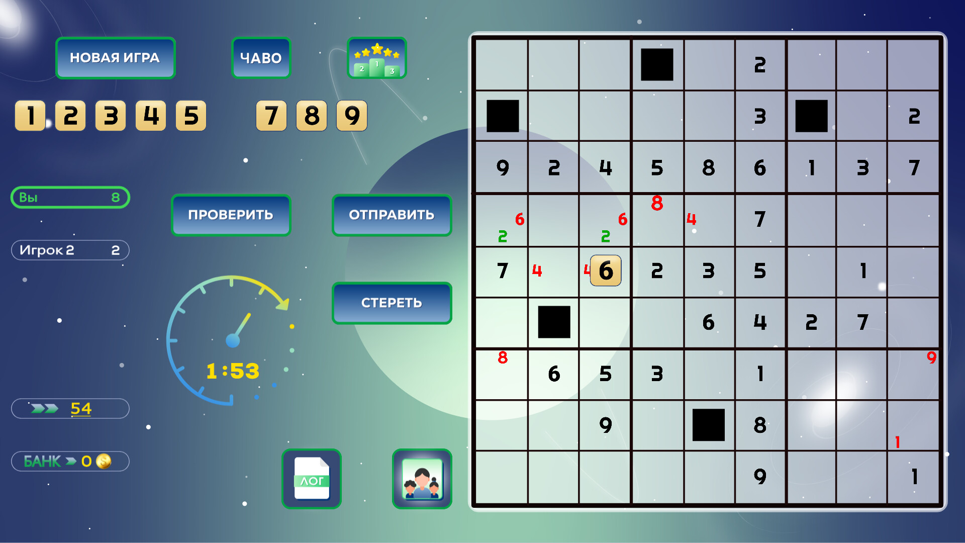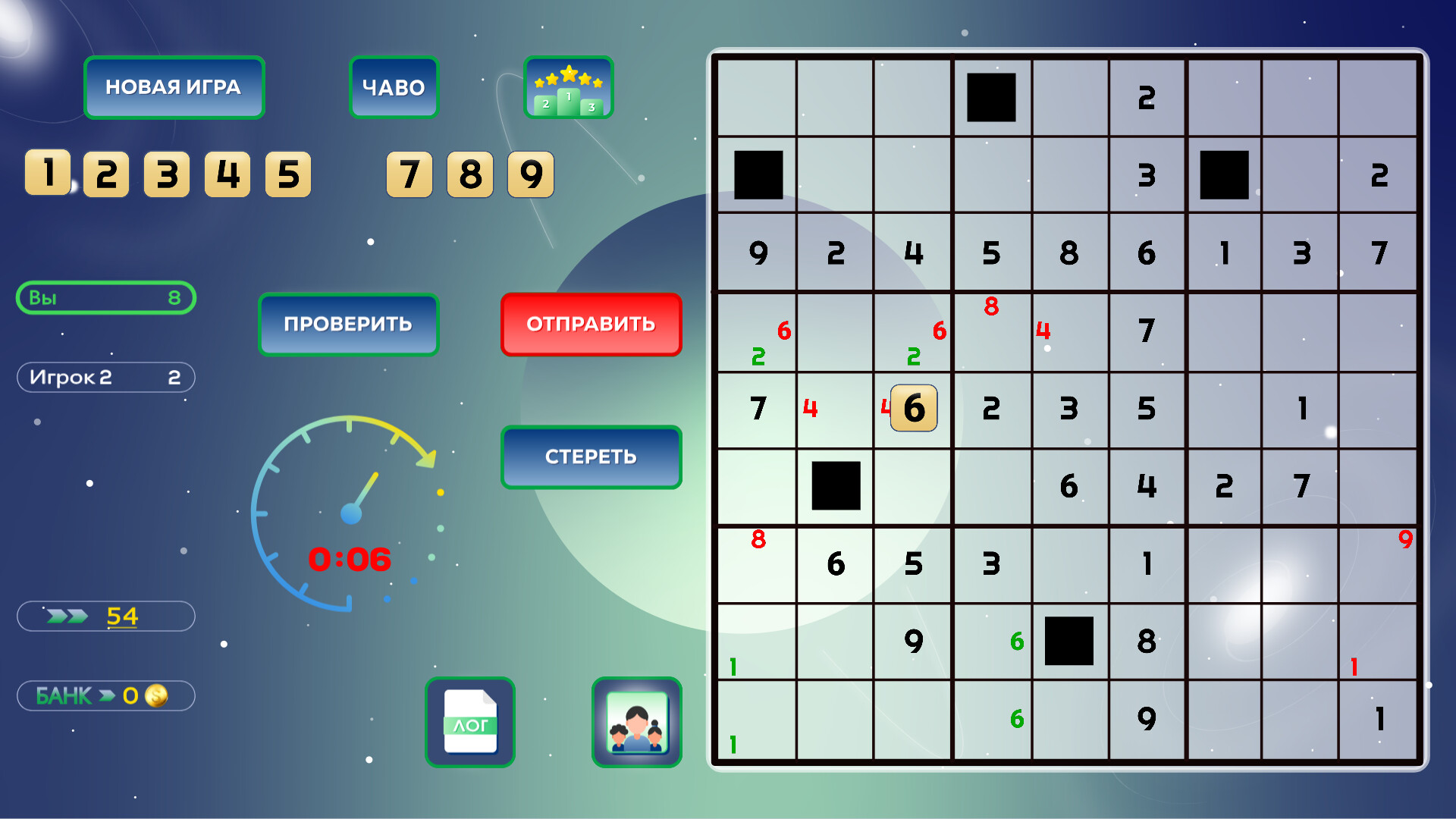 • Ловушки и подсказки: Будьте осторожны! Если вы совершите ошибку и поставите неверную цифру, на этом месте появится маленькая, пугающе красная метка. Она будет видна обоим искателям, и больше никто из соперников не сможет поставить такую цифру это место. Но у вас есть и тайное оружие — пометки. С помощью волшебной кнопки "Проверить" вы можете поставить маленькие зелёные цифры в ячейки - это ваши личные догадки или уверенные выводы. Эти заметки будут невидимы для вашего соперника, что поможет вам перехитрить его.