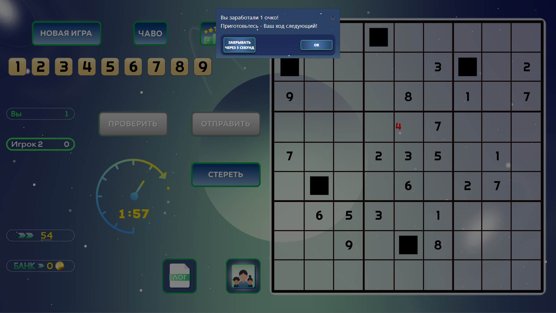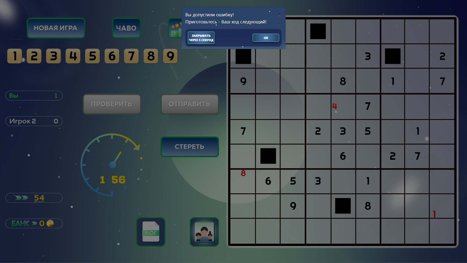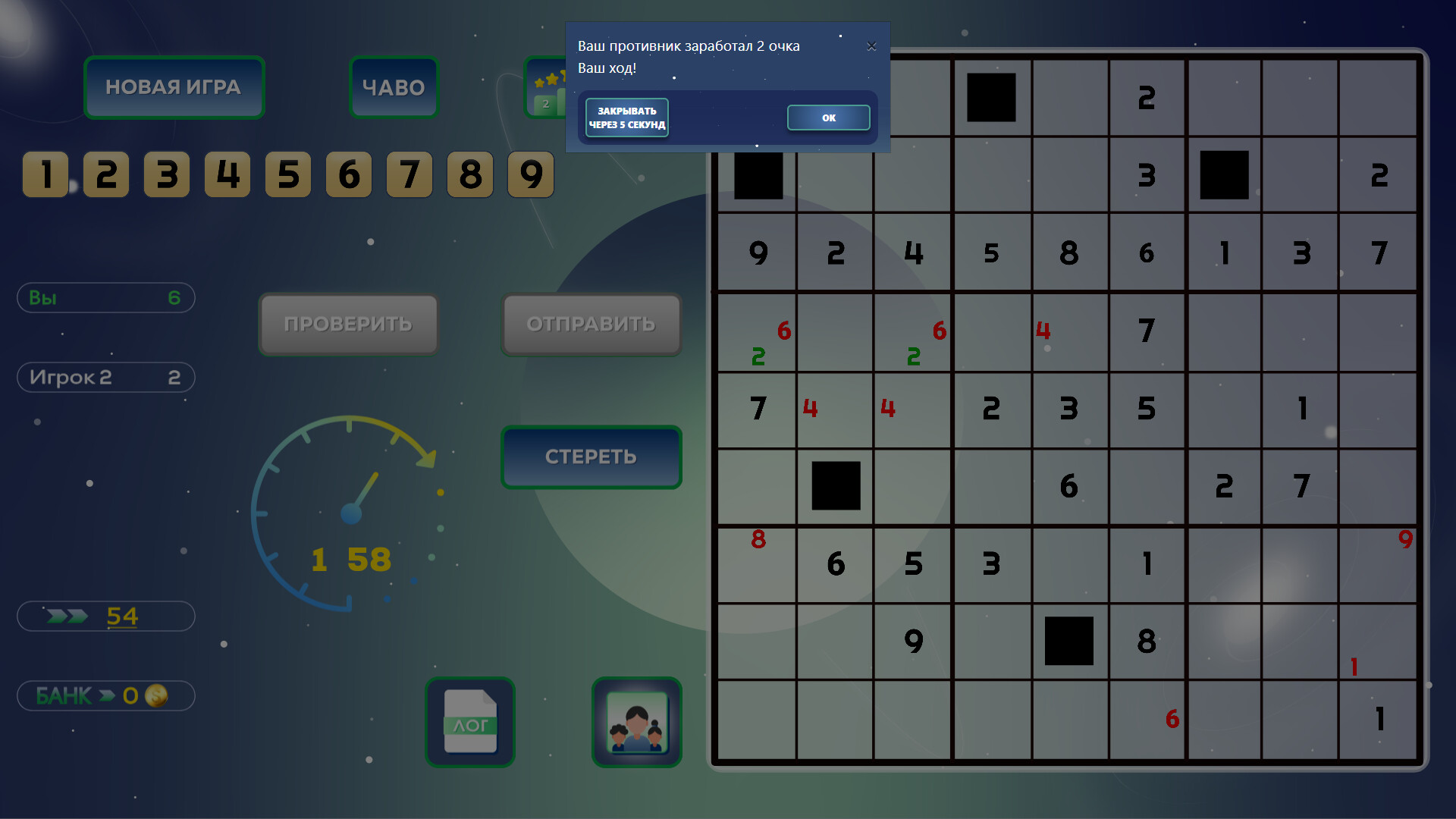 • Ловушки и подсказки: Будьте осторожны! Если вы совершите ошибку и поставите неверную цифру, на этом месте появится маленькая, пугающе красная метка. Она будет видна обоим искателям, и больше никто из соперников не сможет поставить такую цифру это место. Но у вас есть и тайное оружие — пометки. С помощью волшебной кнопки "Проверить" вы можете поставить маленькие зелёные цифры в ячейки - это ваши личные догадки или уверенные выводы. Эти заметки будут невидимы для вашего соперника, что поможет вам перехитрить его.
