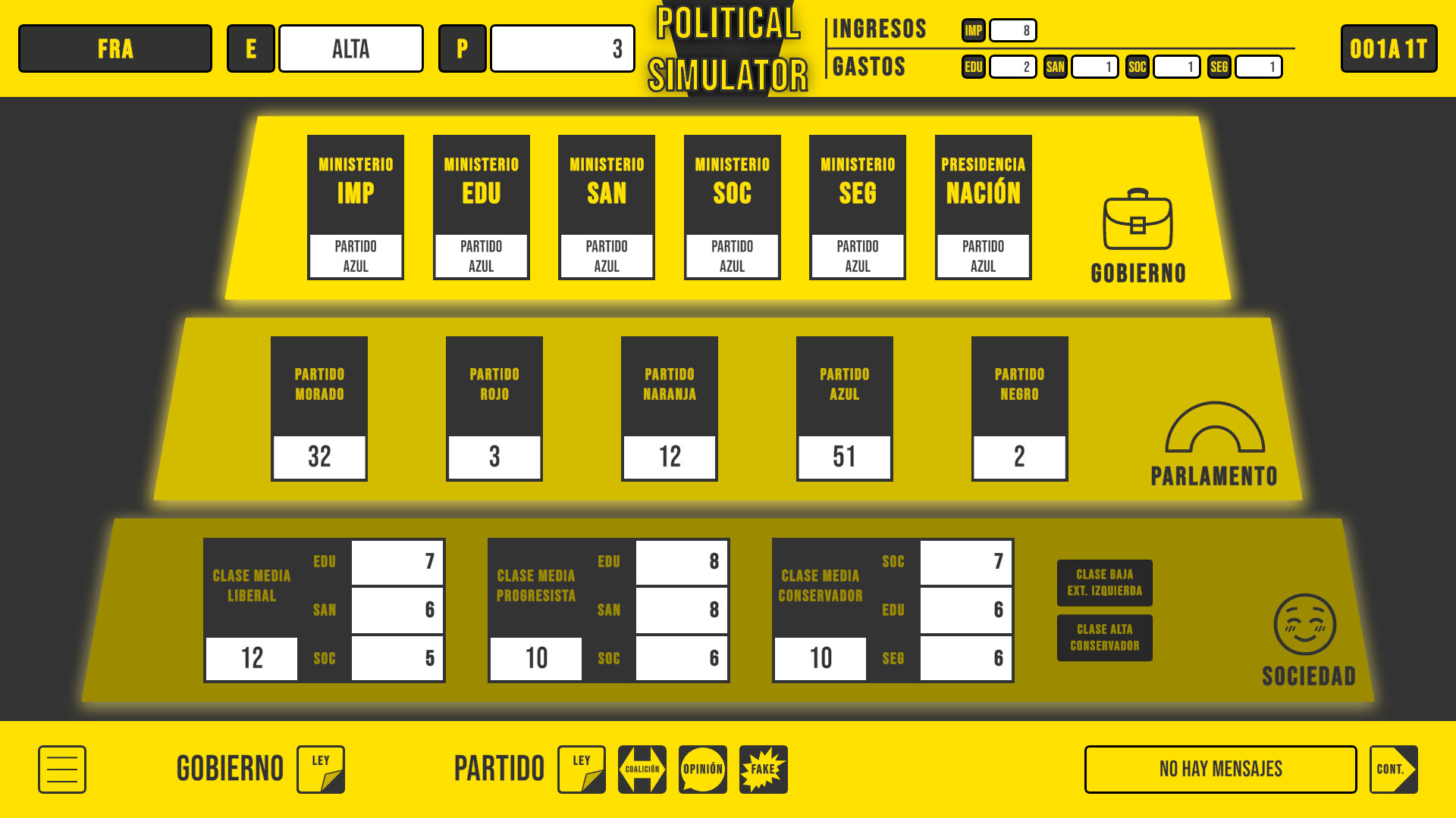 Political Simulator is a turn-based strategy game where you lead a political party. From the most radical to the ideological center, you'll have to navigate complex parliamentary dynamics, influence other political forces, pass laws, and gain the support of a diverse and changing society