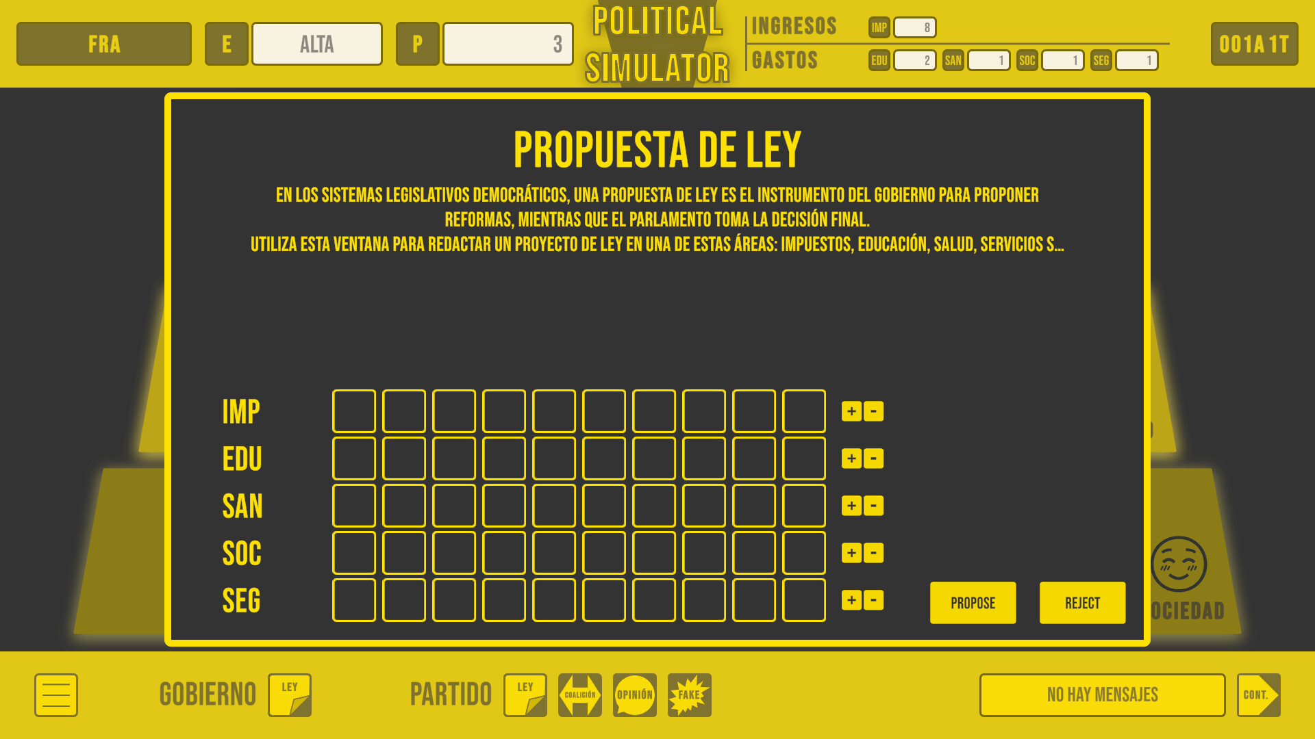 Political Simulator is a turn-based strategy game in which you lead a political party within a democratic system. From the most radical fringes to the ideological center, you will have to navigate complex parliamentary dynamics, influence other political forces, pass key laws, and gain the support of a diverse and changing society.