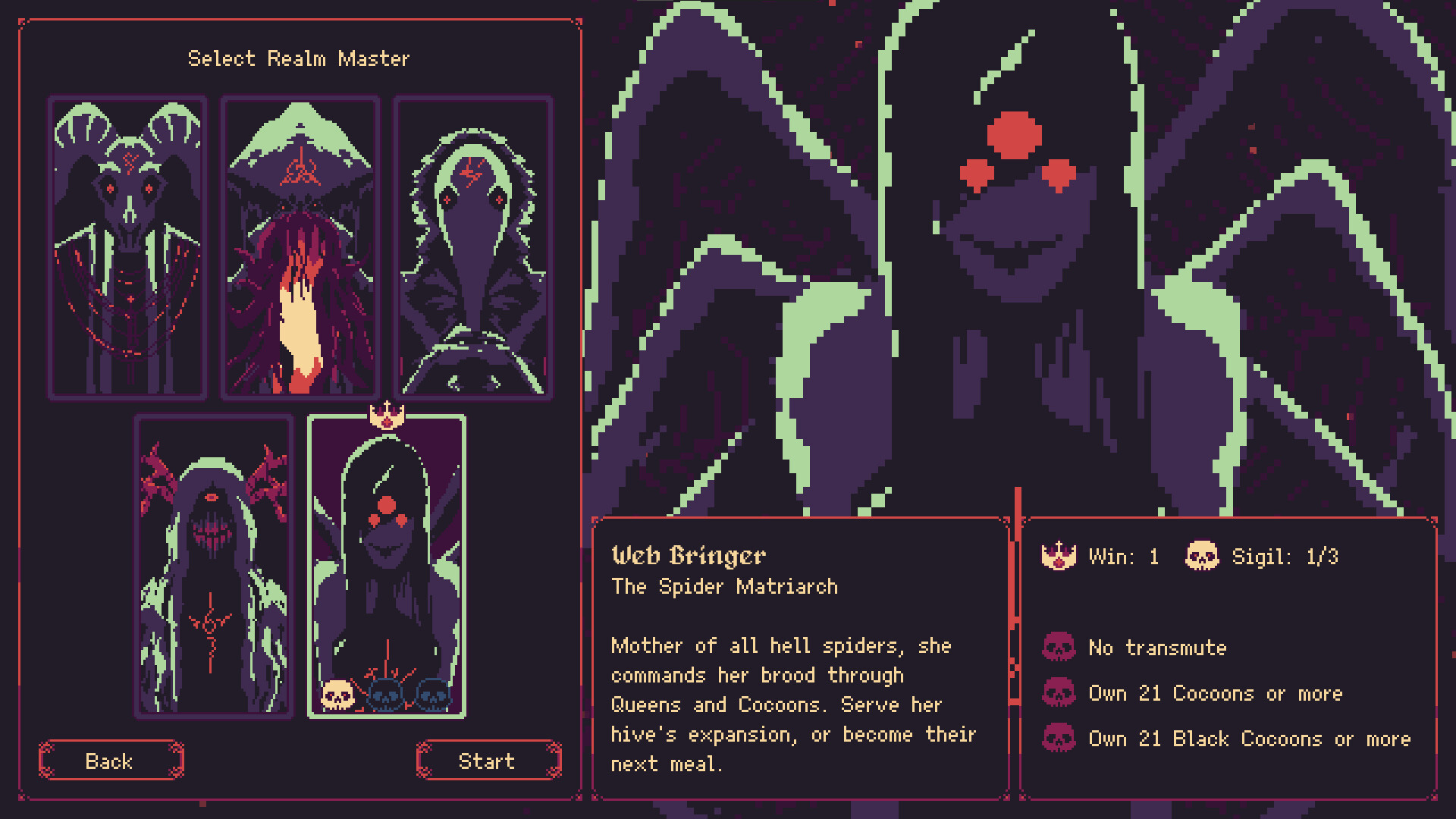 Hver bygningsplacering har betydning. Placer strukturer for at skabe kraftfulde synergier, der genererer Sjæle - din primære valuta. Dårlig placering fører til ressourcemangel, mens mesterlige synergi-kæder holder din infernalske konstruktion i live. Bygninger låses op dynamisk baseret på deres omgivelser: Edderkoppedronninger dukker kun op ved siden af Edderkoppereder og skaber et udviklende puslespil af muligheder.