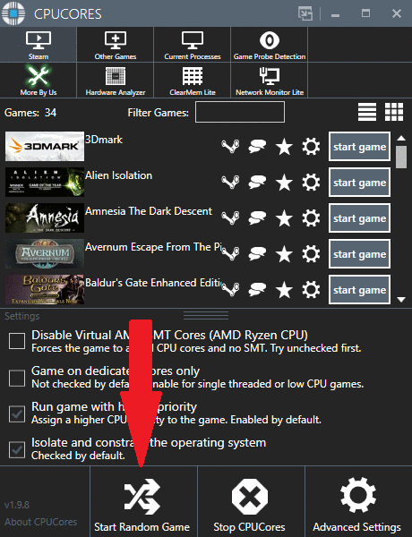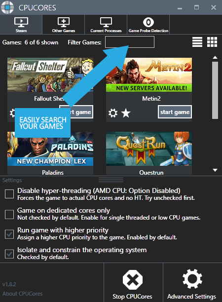 CPUCores will then free up a block of CPU resources and dedicated it specifically for a game. You can then launch a Steam game, or any game/program, directly via the CPUCores application. This enables CPUCores to control the processor usage for that game/program and ensure it has dedicated usage to processing cores. Your game no longer has to share resources with the OS / other applications.