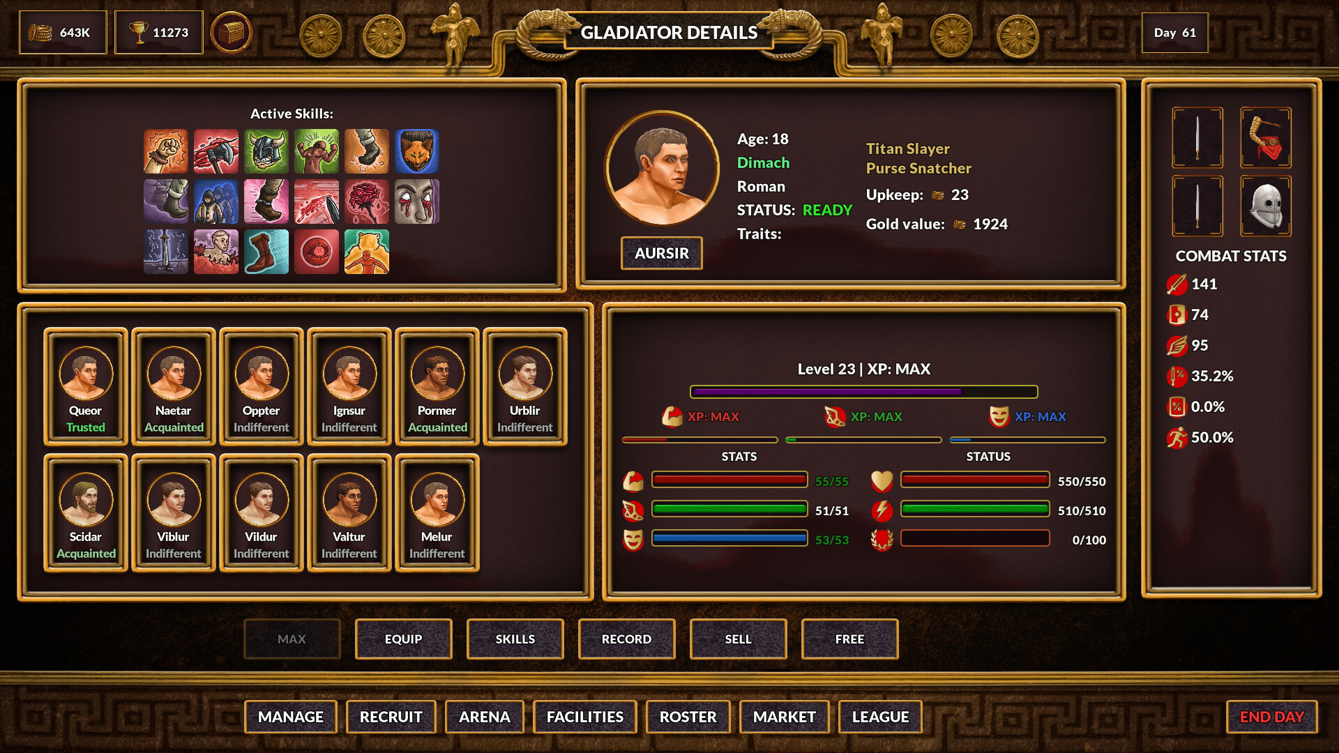 • Train and develop gladiators with distinct stats, traits, and skill progression.