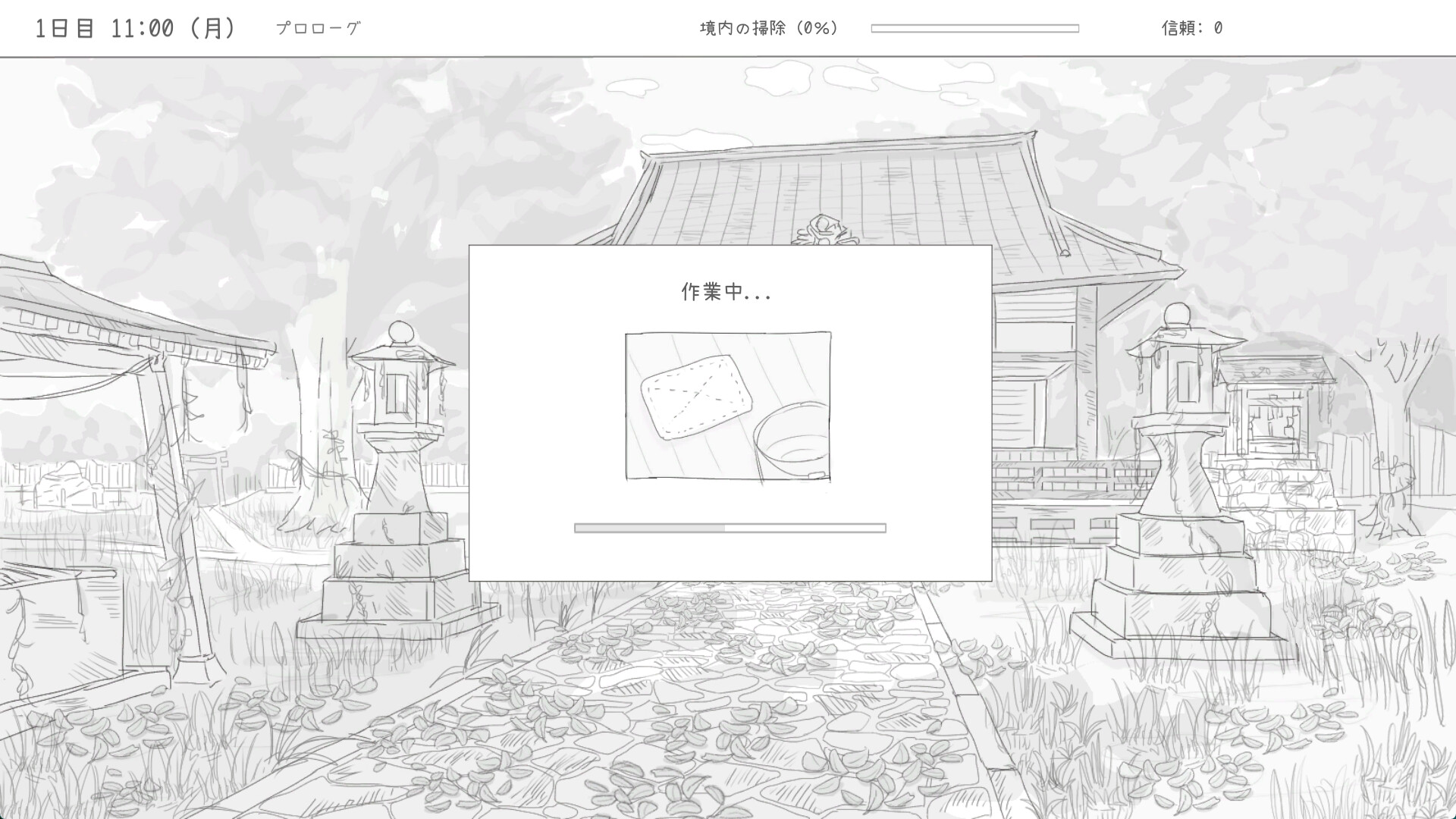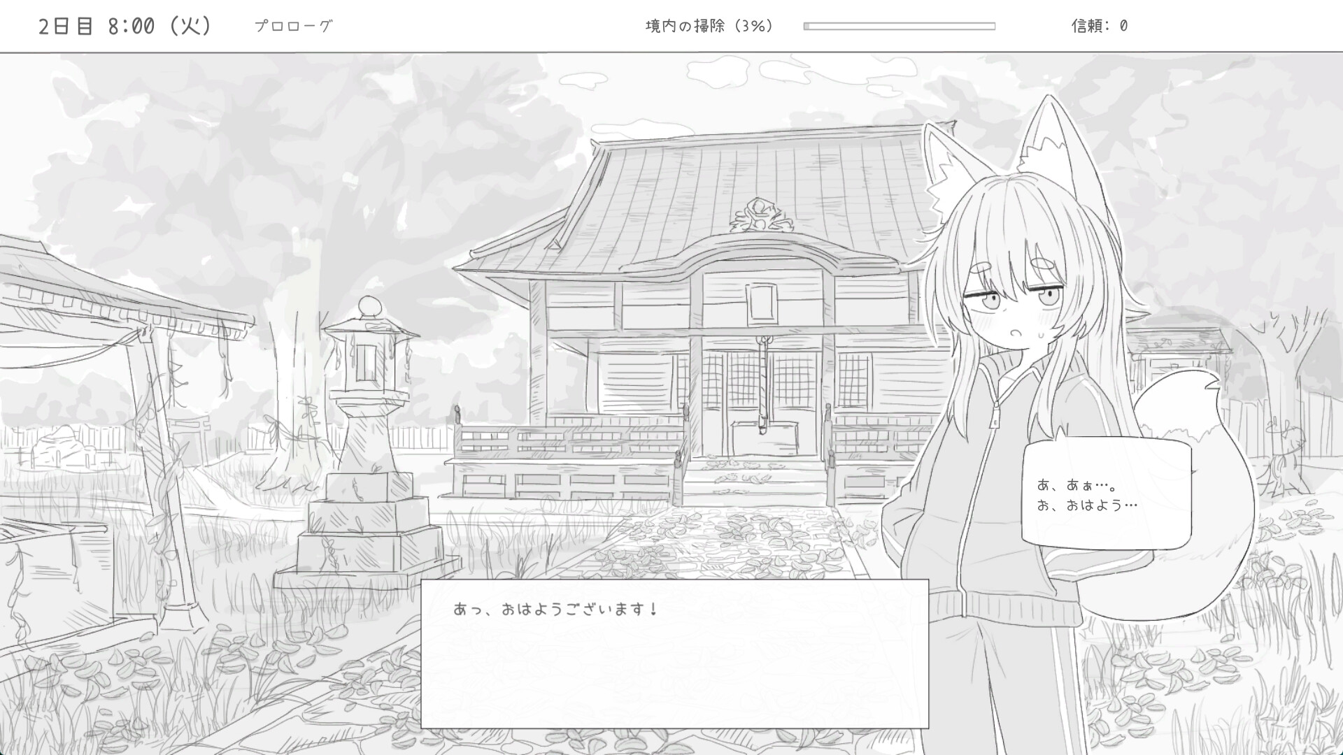 “デモ版での情報。亡くなった祖父に代わって、神社を掃除しよう。狐の神様・万尾(まお)とコミュニケーションを取りつつ、信頼を勝ち取ることで、エンディングが変わるようだ。神社の掃除は計2回。夜のコミュニケーションは計3回行える。しかし、BGMがないので、ポチポチゲーと変わらないので、ちょっと飽きるのが早そうなのがネックか。”