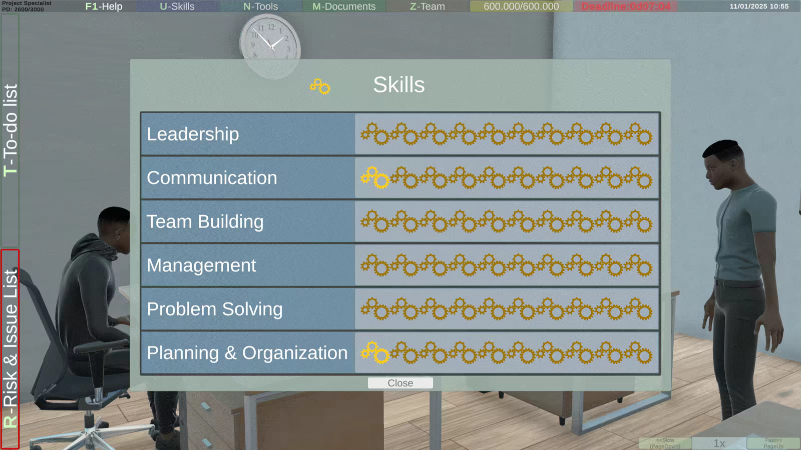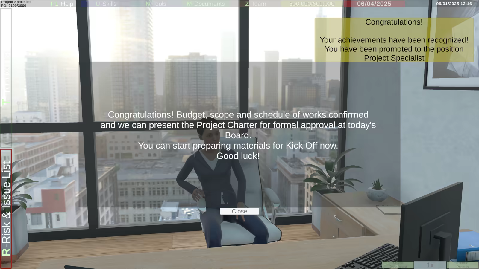 Next, you'll be tasked with collecting key data necessary to create the first project document, the Project Charter. This task is time-limited, depending on the difficulty level of your chosen character. If your chosen character has limited experience (Easy), you don't have to worry about time, but on Hard, there's no time for bad decisions. Completing this series of tasks will also grant you your first promotion on the PM career path.