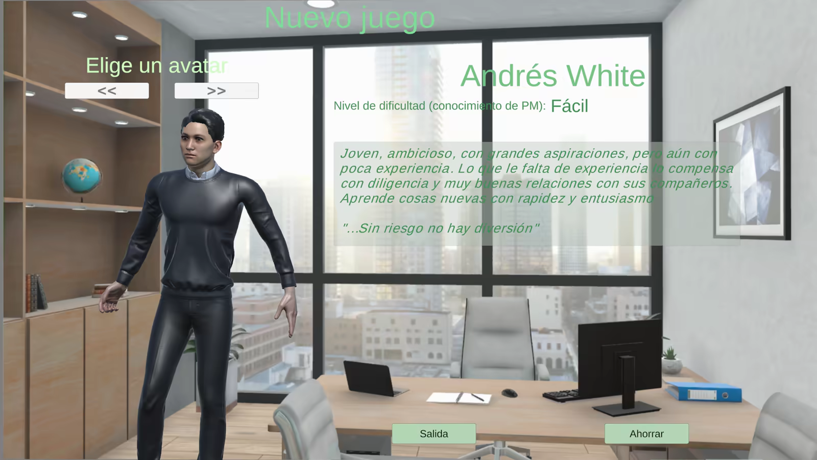 Gerente de Proyecto (Iniciación) comienza seleccionando un personaje entre los Gerentes de Proyecto predefinidos con diferentes niveles de experiencia (lo que también indica el nivel de dificultad del juego). Como recién llegado a la empresa, primero deberás familiarizarte con la distribución de las salas y localizar a las personas clave en el edificio de oficinas con las que colaborarás. Tu capacidad para desenvolverte en la empresa determinará en gran medida el éxito de tus tareas con límite de tiempo.