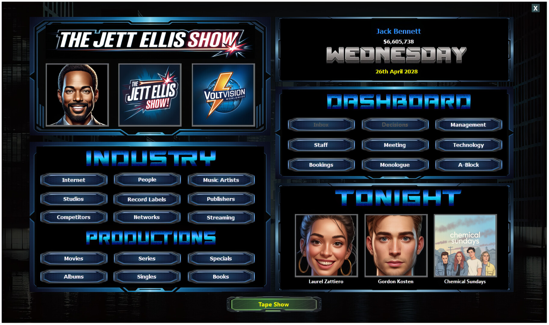 Build your dream late-night TV empire in this deep management sim. Book celebrity guests, shape your show's identity, hire staff, craft unforgettable episodes, and battle rival networks for ratings, relevance, and cultural dominance in a living entertainment world of fame.