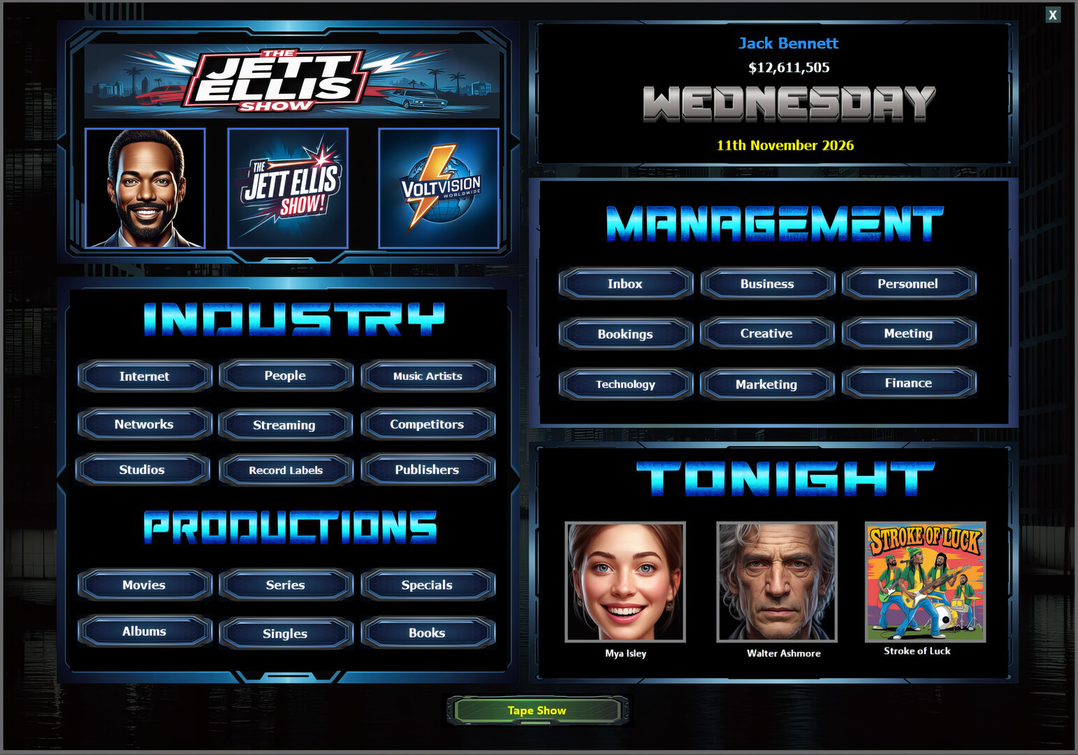 A strategic late‑night talk show management sim where you book guests, manage staff, craft episodes, negotiate network deals, and outsmart rival producers to dominate the ratings.