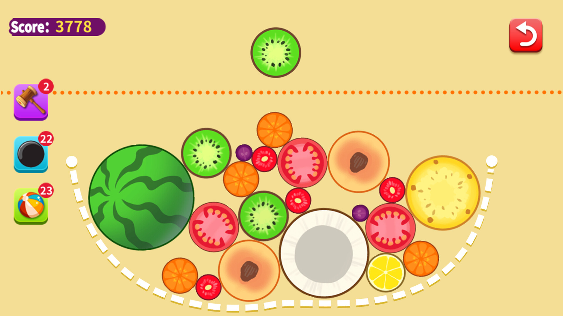 A fun Make Watermelon, magical fruit merging, the gameplay is simple but top-notch, so fun that you can't stop at all. The game is based on the theme of watermelon. You only need to collide the same fruits to synthesize. Come and challenge! Three special props: Hammer: One click, you can crush any kind of fruit; Bomb: You can eliminate two adjacent fruits at the same time; Color ball: can eliminate all fruits of the same color.