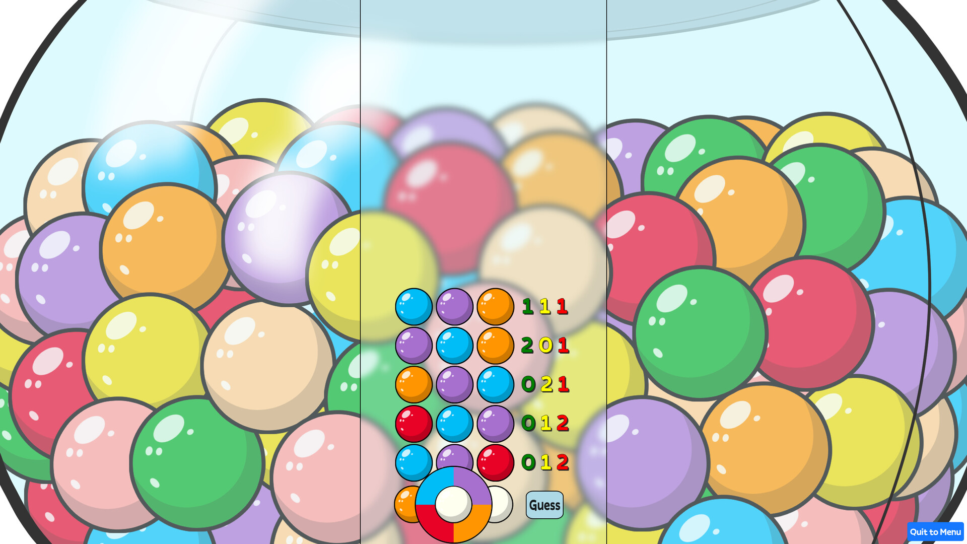 A colorful code-guessing puzzle game where you must decipher the correct combination of gumballs to solve the puzzle.