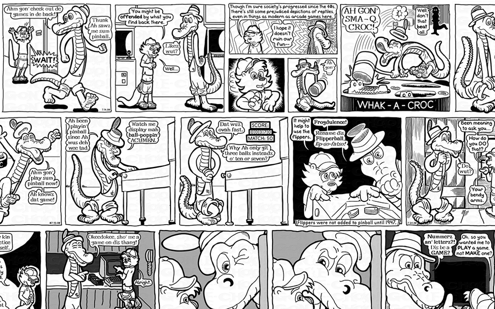 'Gon' E-Choo!' is a 3 stage, arcade-style game based on the earliest arcade platformers. Collect 10 letters in each stage while avoiding an irate and unrelenting gator!
