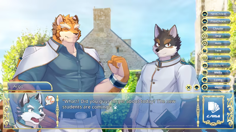 KnightsCollege 2 is a kemono visual novel set in the Knight College, where elite knight candidates live. In this game, every choice is presented as a card, and the protagonist lives in the dormitory while collecting cards.