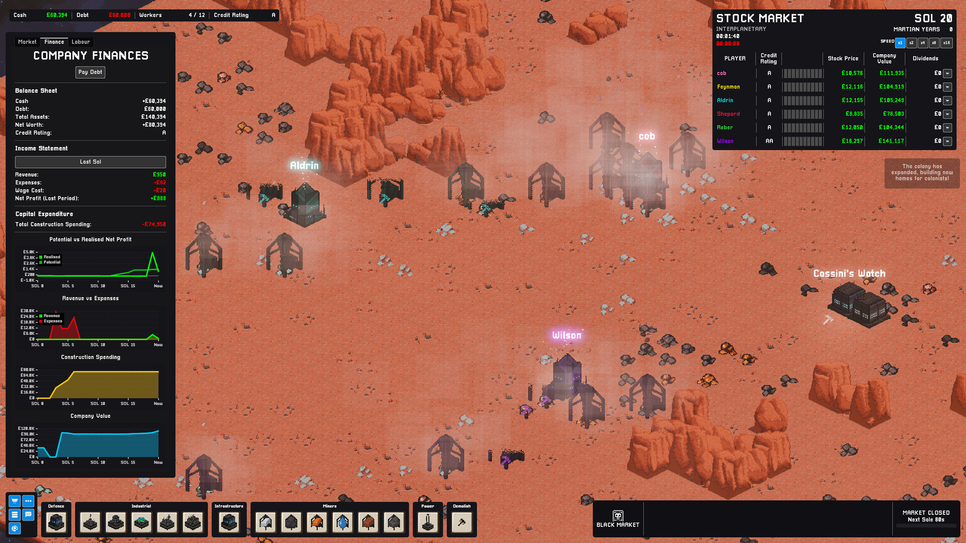 Todas las corporaciones comienzan en igualdad de condiciones en Harwell, un juego de estrategia económica para un jugador y multijugador ambientado en el Planeta Rojo. Construye tu empresa, controla la producción y comercia en una economía dinámica impulsada por los jugadores, donde la oferta y la demanda en constante cambio pueden llevarte a enormes riquezas – o a la quiebra.