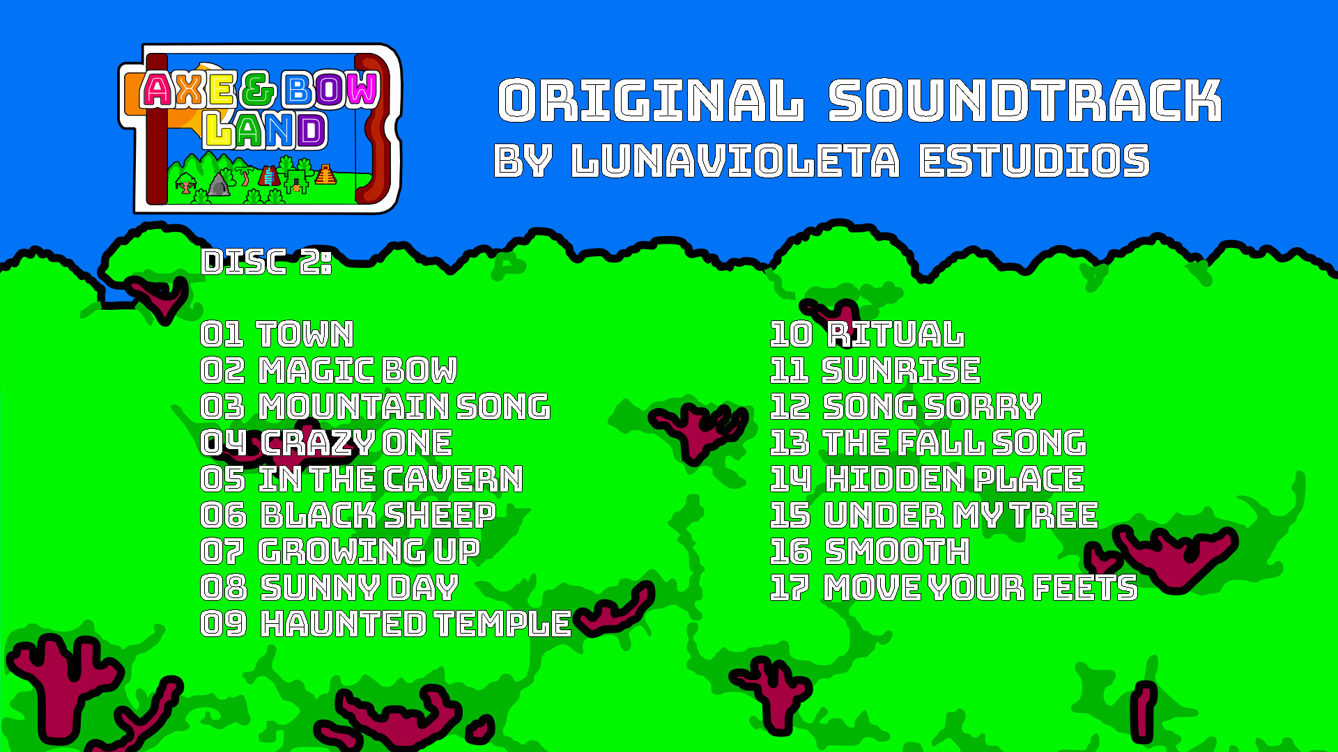 Dive into the vibrant world of Axe & Bow Land with its captivating soundtrack. Featuring 21 main tracks and 17 exclusive additional compositions not found in the game, this soundtrack offers a diverse blend of serene melodies and lively tunes. From tranquil compositions that evoke a sense of wonder to upbeat tracks with infectious rhythms, experience a unique mix of arcade, electric piano, and drum beats, accompanied by Aztec-inspired wind instruments. Enhance your gaming experience with the unforgettable melodies of Axe & Bow Land's original soundtrack today.