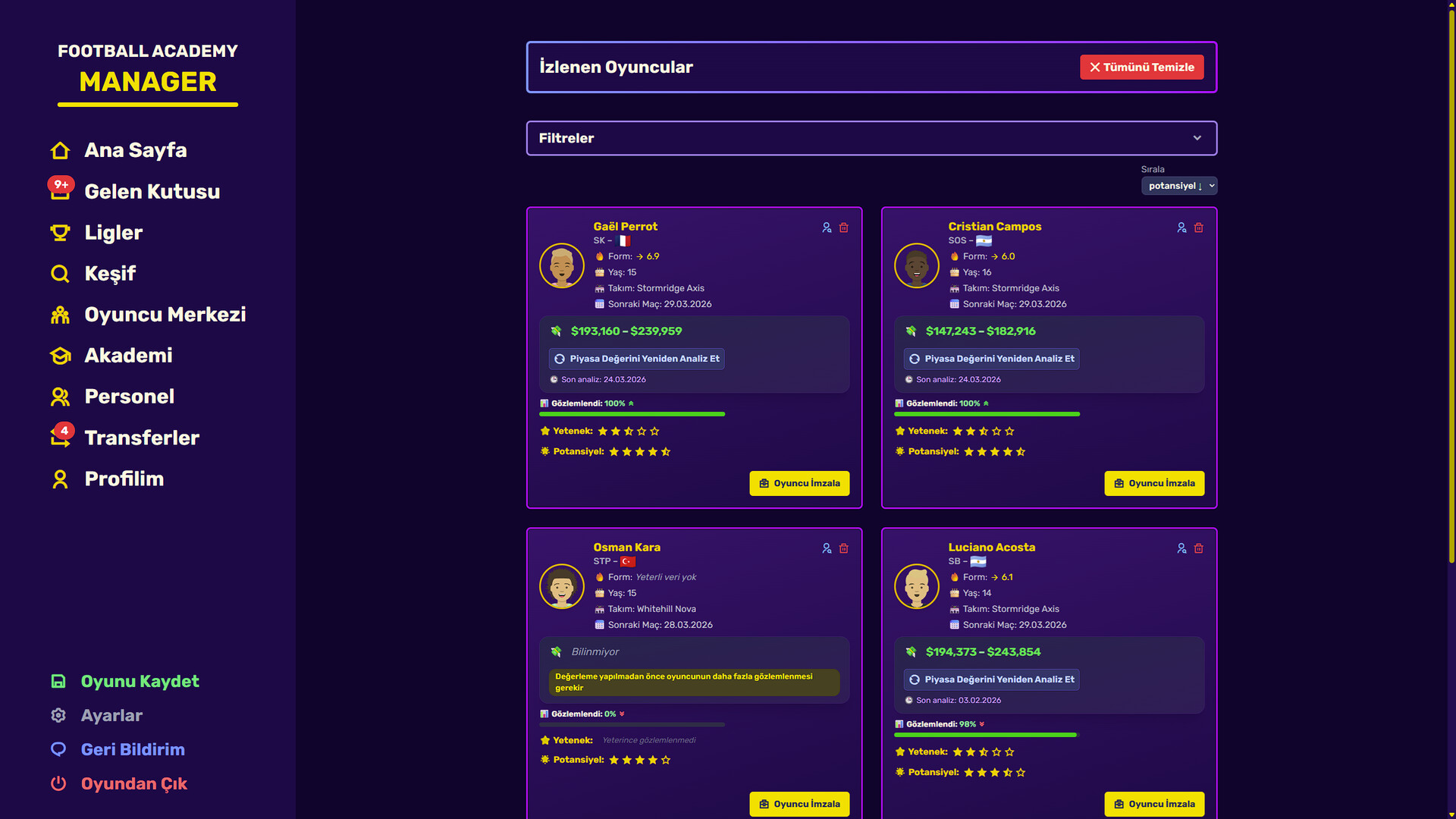 Genç oyuncuları keşfet, güçlü yönlerini ortaya çıkar ve akademine kat. Onları antrenmanla geliştir, doğru zamanda transfer görüşmeleri yap ve her başarıyı futbol dünyasında itibarını artırmak için kullan.