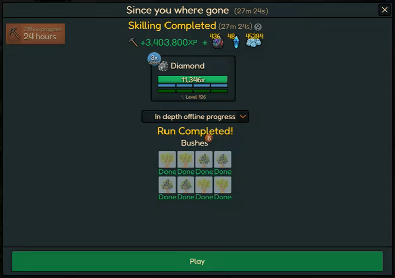 • When you return, get a detailed summary of all the resources gathered, skills trained, and rewards earned during your downtime.