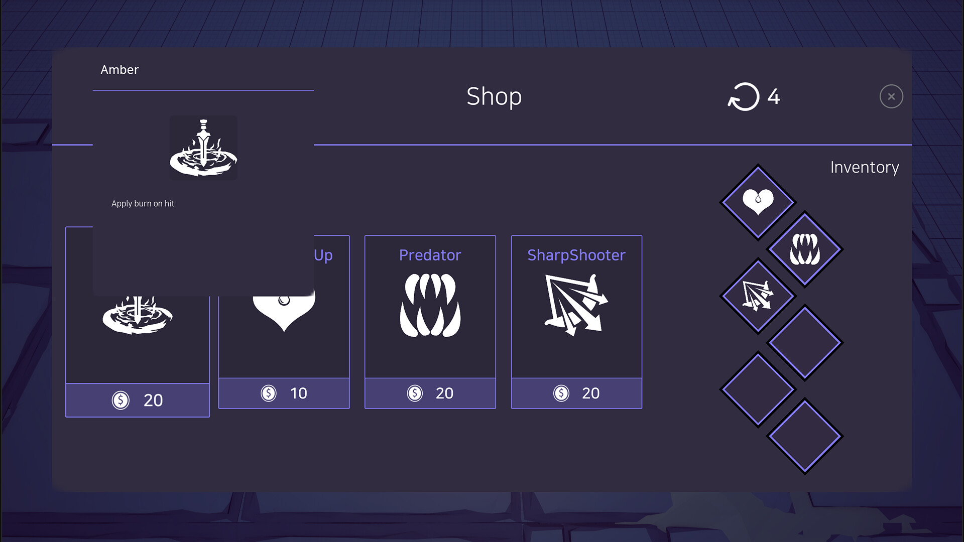 • Two strategic choices await you after every round. First, set the direction of your build by choosing one of three skills offered upon leveling up. Next, complete your strategy by purchasing items from the shop with the resources you've gathered, and prepare to take on the next round.