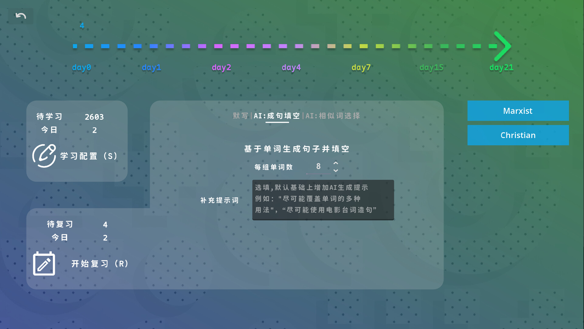 LexiRogue: A unique keyboard spelling game! It blends Roguelite levels, the 21-day scientific memory method, and configurable AI-API for dynamic reviews. With leaderboards and an achievement system.Currently designed for native Chinese speakers to learn foreign languages.