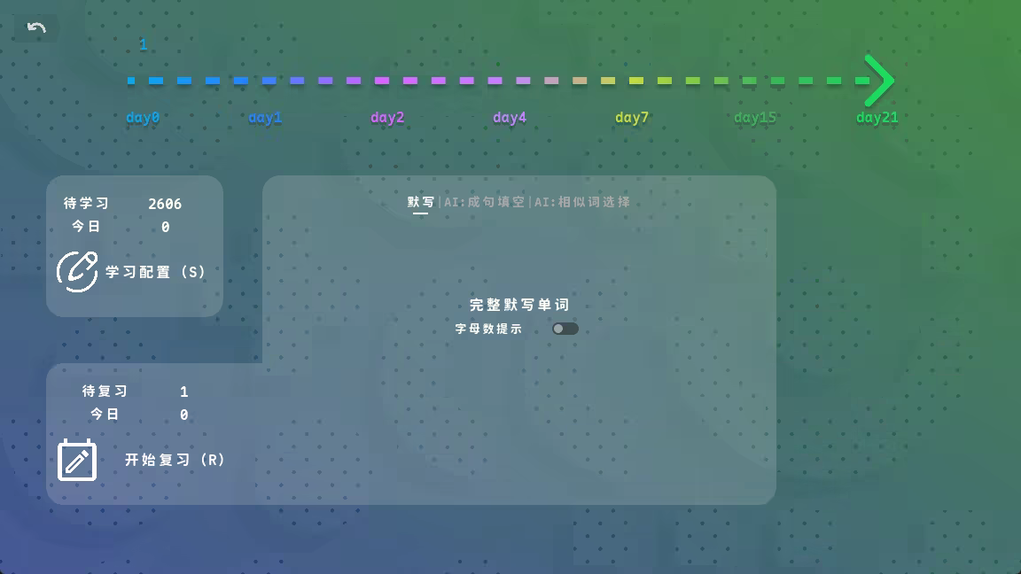 Additionally, based on the 21-day memory model, the system will prompt you to review the words for the day. Once completed, the number of words indicated by the arrow will advance sequentially until the entire word bank is finished. The basic review includes "dictation," where you write out the words based on prompts.