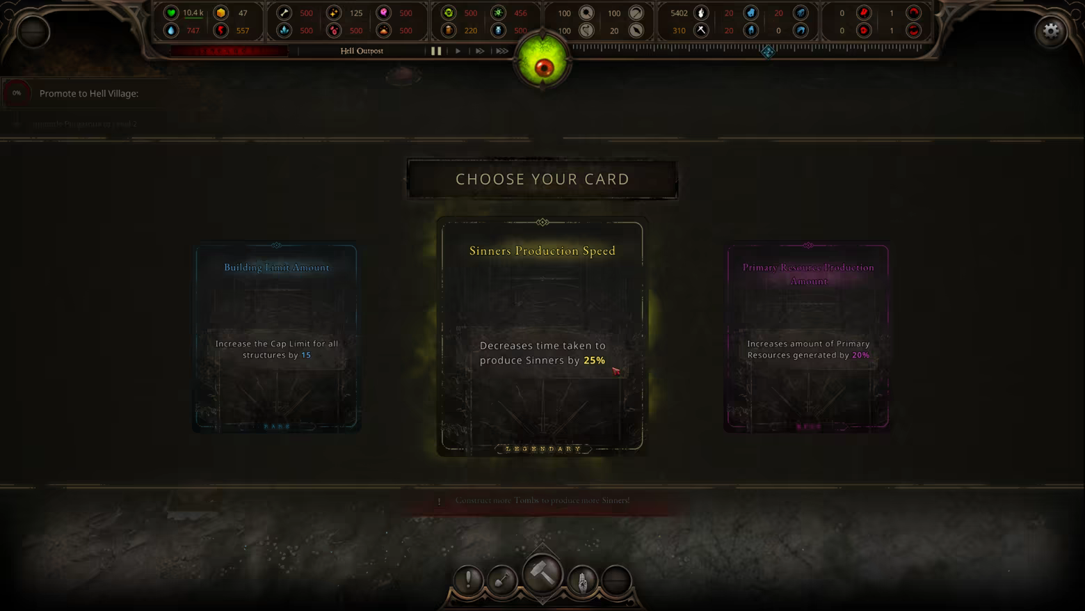 Hell demands tribute. Sacrifice resources to unlock passive cards and access greater power. Earn roguelike card choices that permanently affect your run. Stack powerful passives, discover broken synergies, and shape your city’s identity. Every choice changes how the game plays.