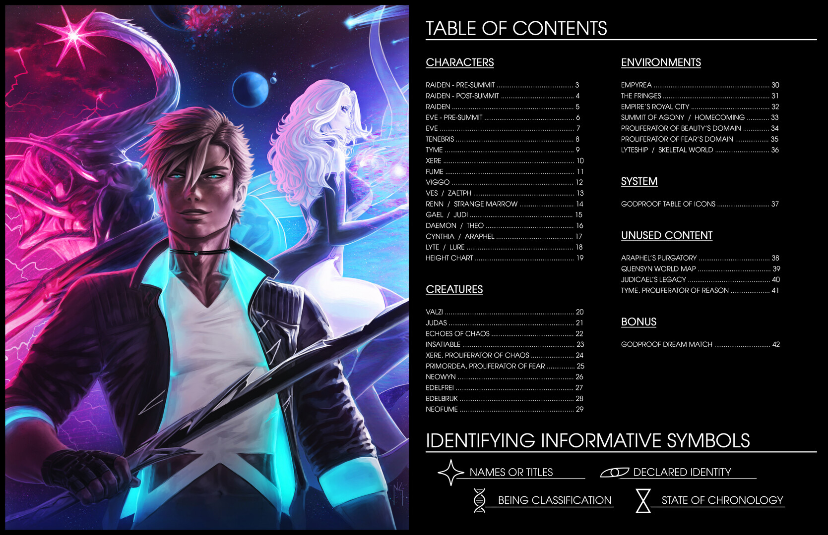 Review the incredible visuals that made GODPROOF come to life through the 42-page artbook PDF; see the concept art in all its stages, and learn about the game's characters in more detail through the author's notes.