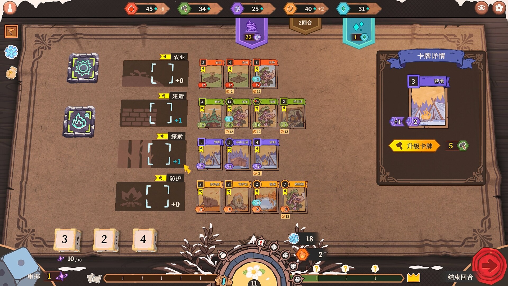 农业、建造、探索或守护——四个区域中的卡牌将产出不同类型的资源。请明智地分配手中的三枚骰子,触发那些最为关键的卡牌。