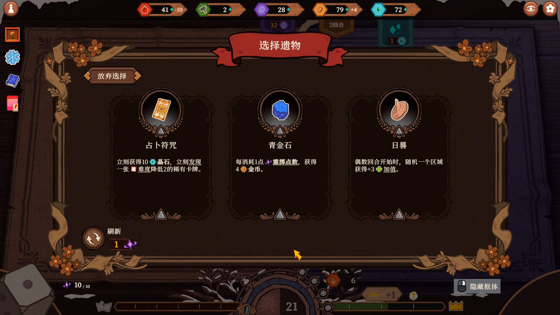 丰富的策略构筑维度——选取卡牌、强化骰面、发现遗物,并在关键时刻使用珍贵的符文石。