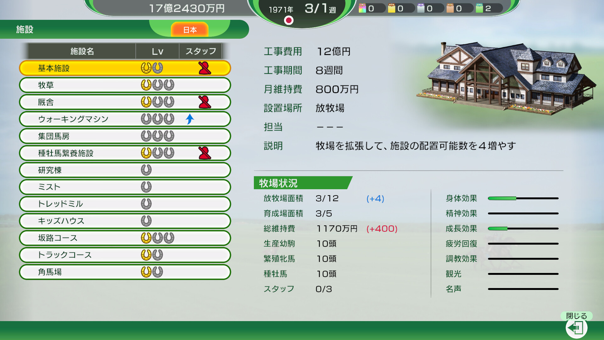 ・牧場施設「基本施設」の効果とは別に、放牧場の面積を増やす効果を得られます