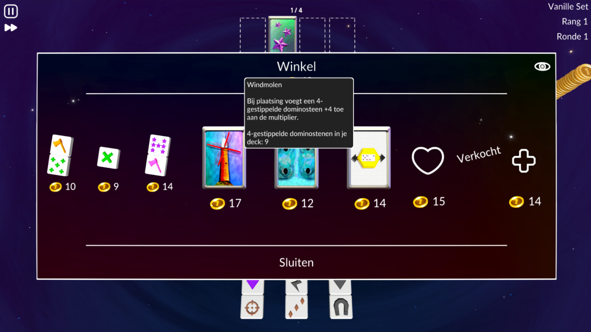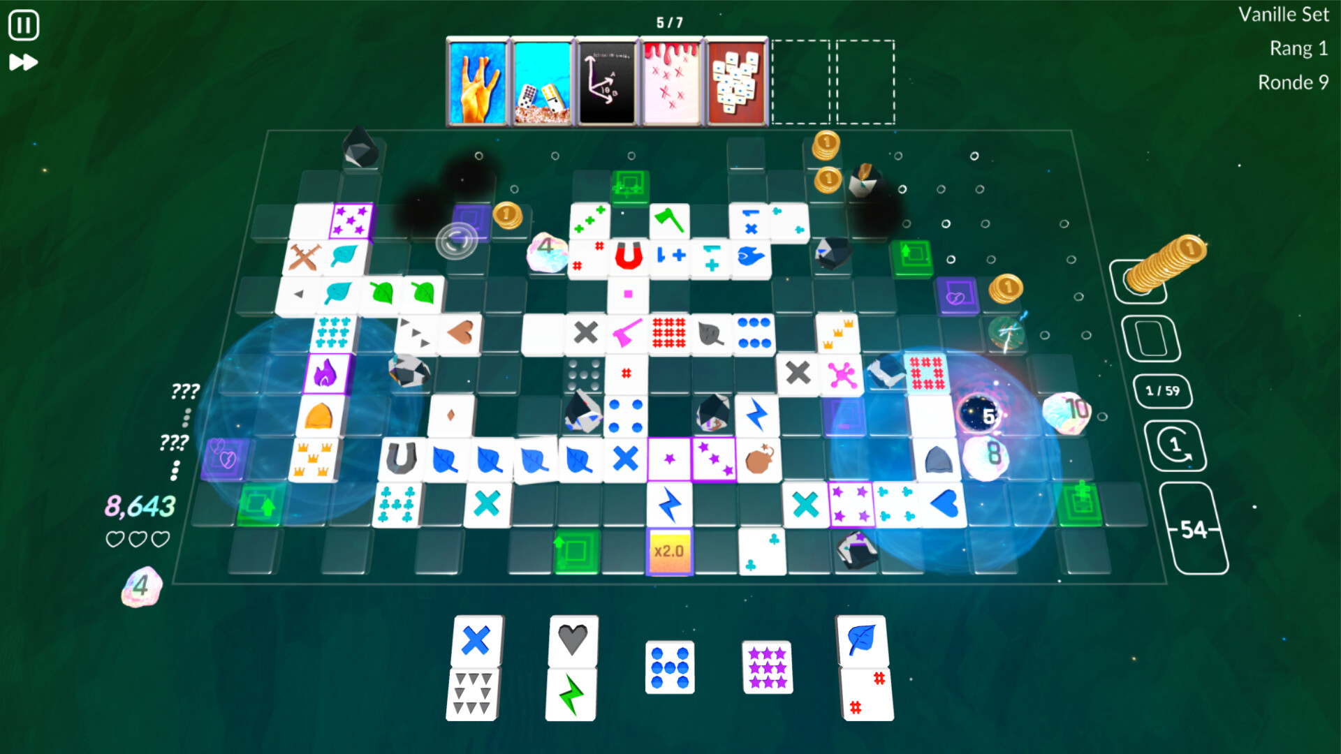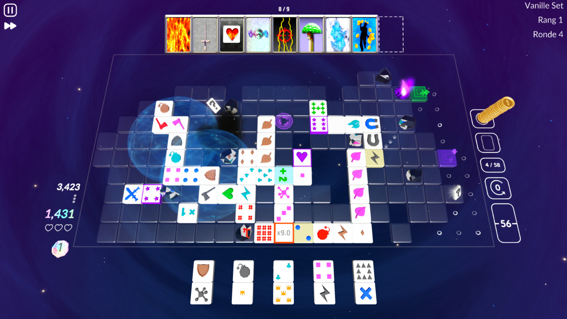 Het succes van je run wordt sterk bepaald door het kopen van Nova-kaarten. Deze kaarten kunnen krachtige effecten of scorebonussen opleveren als je aan hun voorwaarden voldoet. Wanneer je de juiste Nova-kaarten met de juiste dominostenen combineert, ontstaan er waanzinnige synergieën.