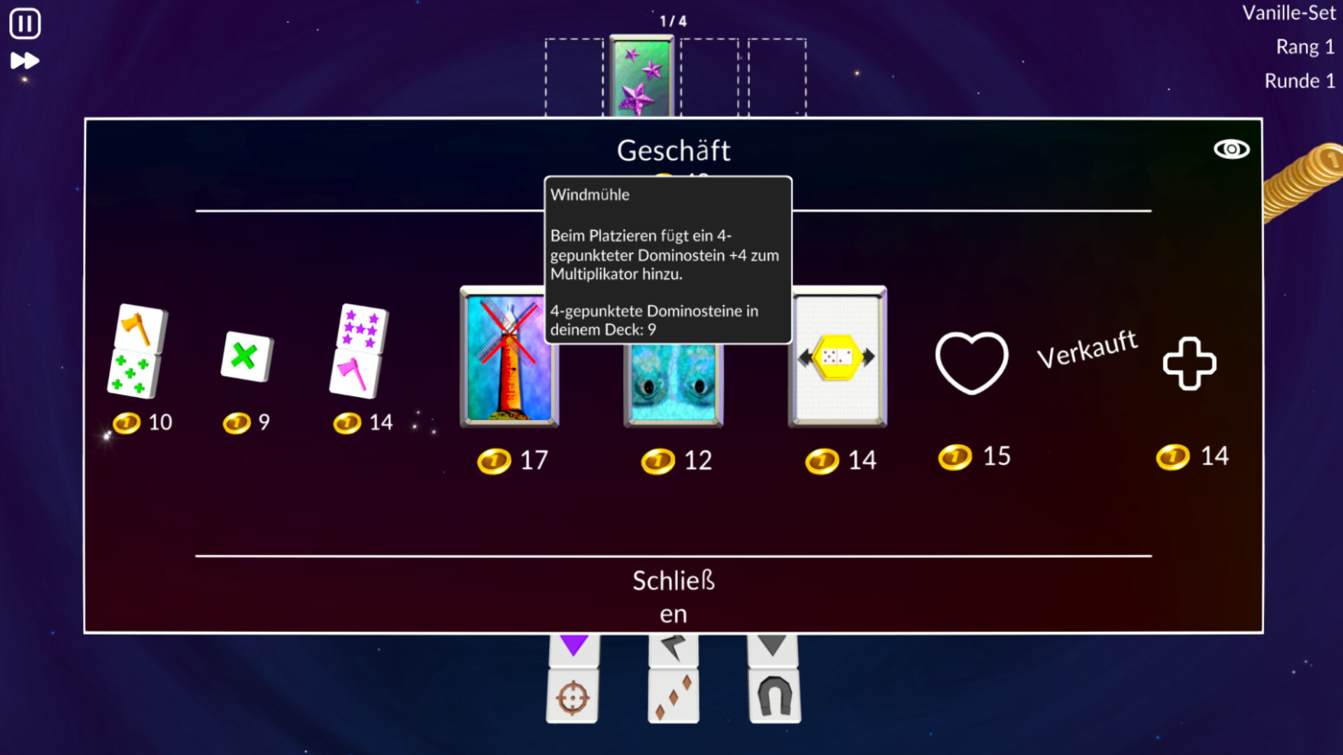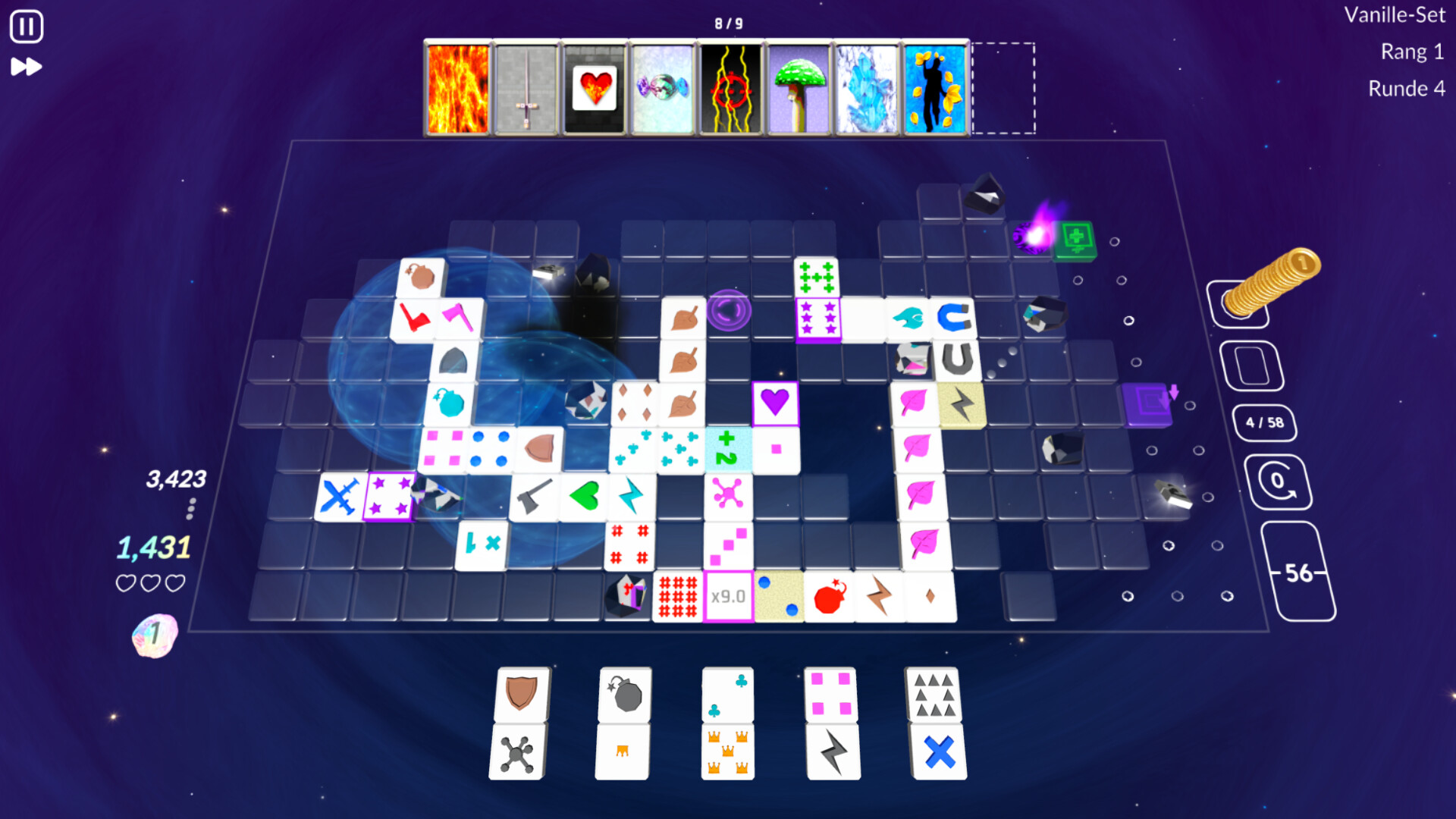 Der Erfolg deines Laufs hängt stark vom Kauf von Nova-Karten ab. Diese Karten können mächtige Effekte oder Punkteboni erzeugen, wenn du ihre Bedingungen erfüllst. Kombinierst du die richtigen Nova-Karten mit den passenden Dominosteinen, entstehen verrückte Synergien.