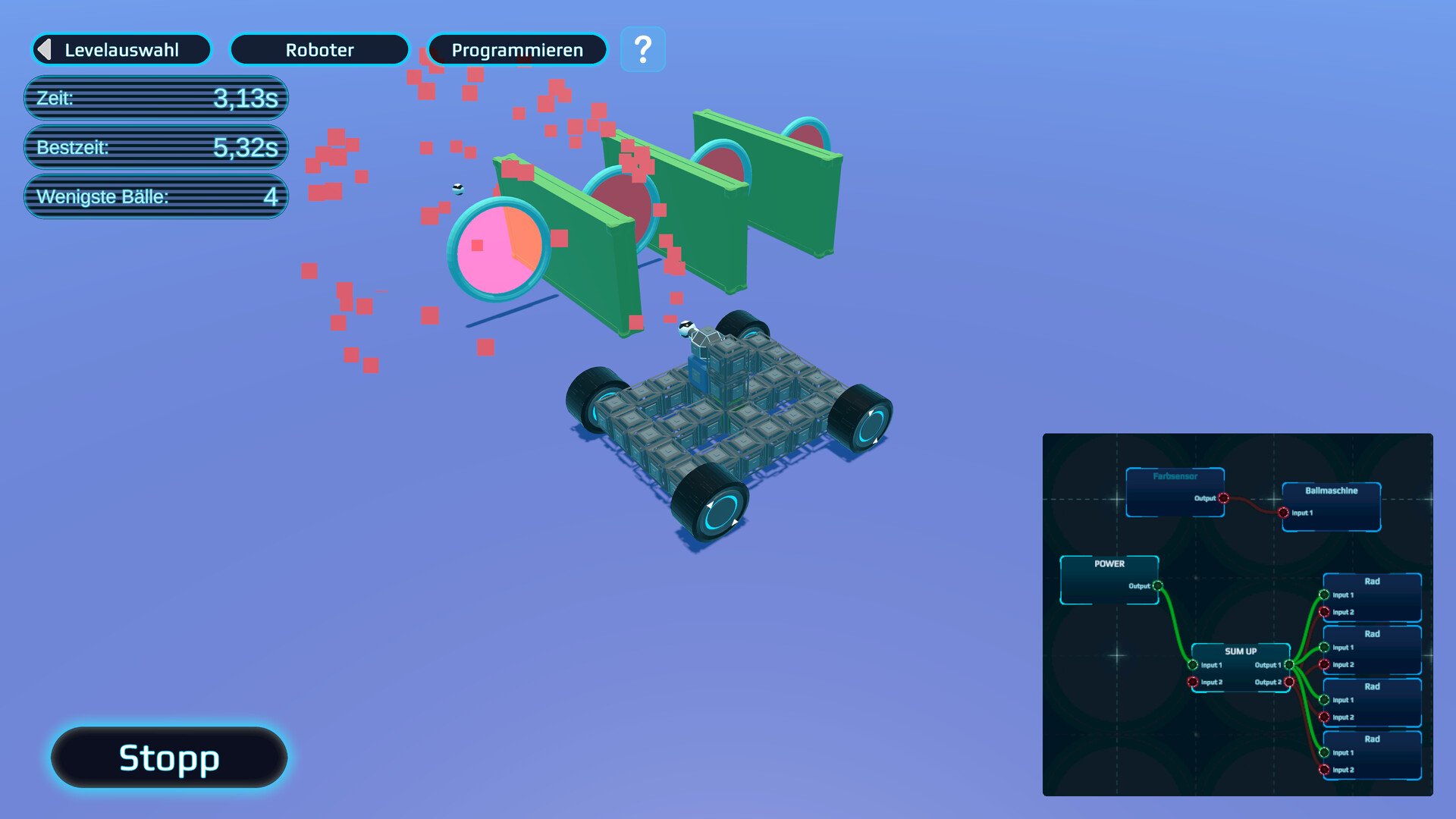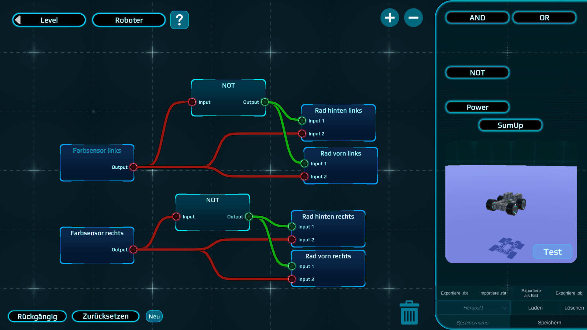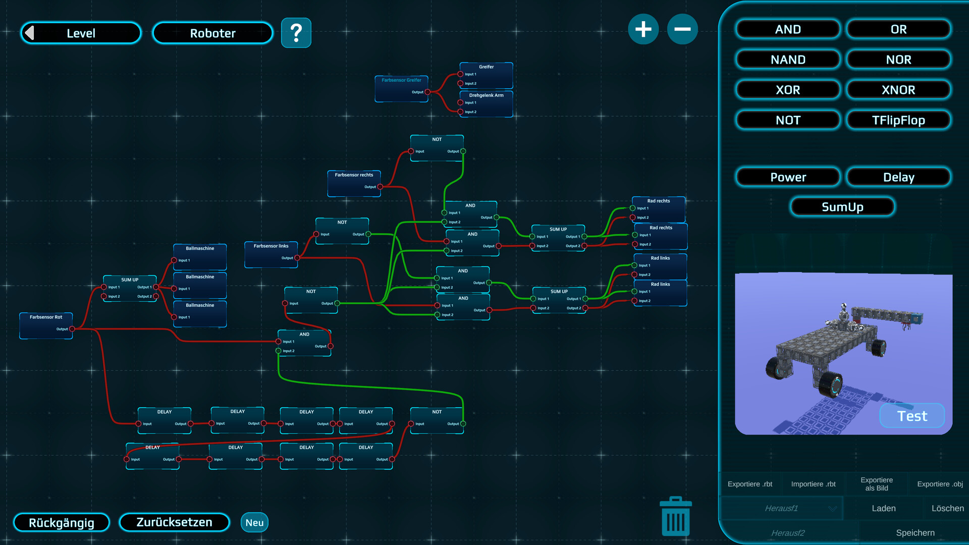 In dieser Roboter-Simulation löst du Logik-Rätsel und Hindernis-Parcours! Tauche ein in die spannende Welt der Robotik und Programmierung! Erschaffe deinen eigenen Roboter, verbinde Logikbausteine und bring ihm bei, knifflige Aufgaben zu lösen!