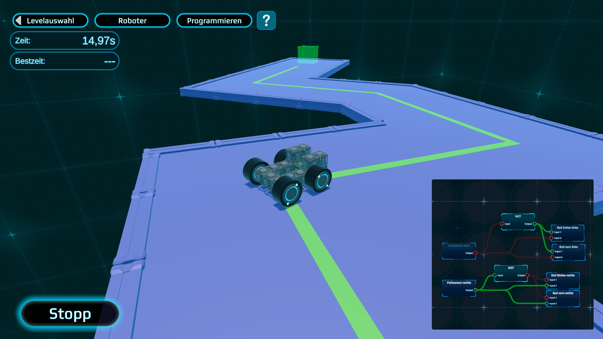 Verknüpfe Logikbausteine, um deinem Roboter beizubringen, was er tun soll! Programmiere, wie er auf die Welt um sich herum reagiert, damit er das Ziel des Levels erreicht!
